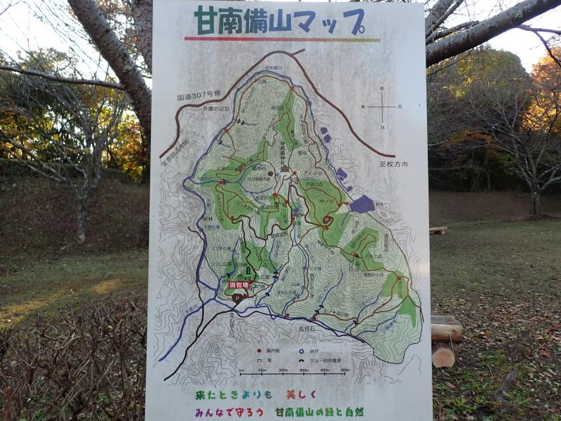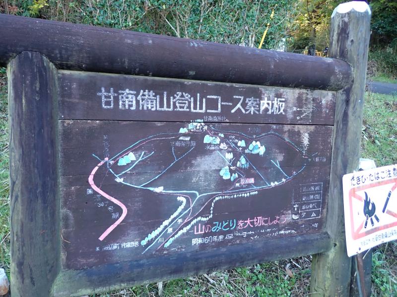 - 駐車場~35分~展望台~10分~神南備神社~5分~甘南備山(221m)~20分~峰の森分岐~35分~駐車場