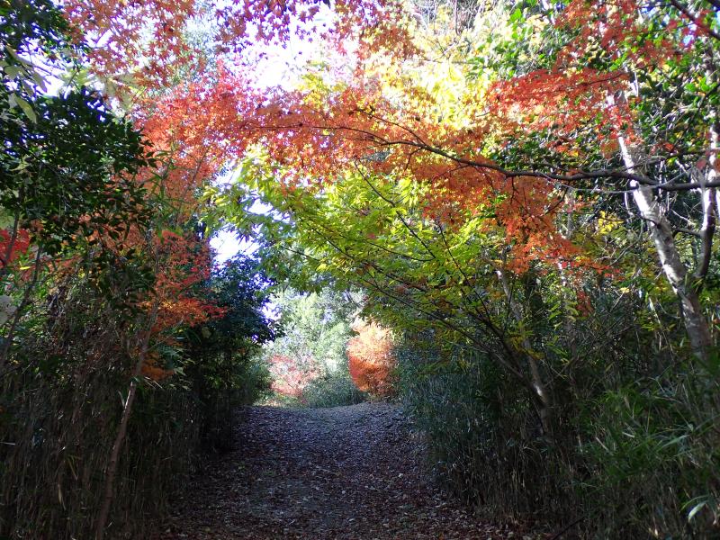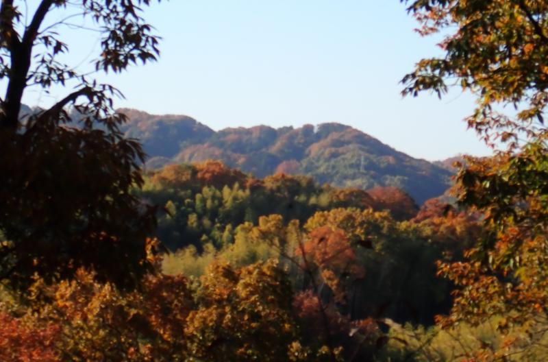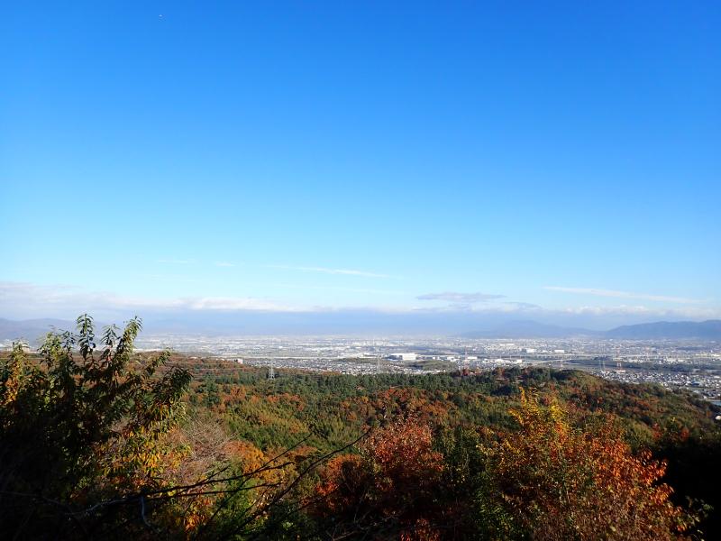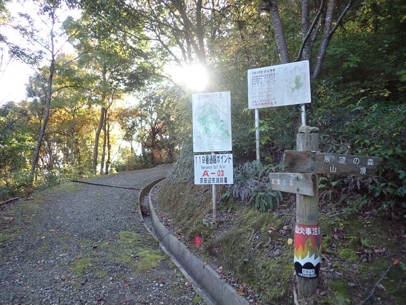 駐車場から管理道路を経由し、ナナカマドの小径、にしきぎの小径を経由して、展望台へ。ここからは、京都市内を南から眺める事ができます。少し歩くと神南備神社経由で甘南備山の山頂に到着。展望なし。