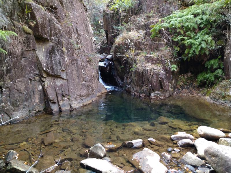 大きな堰堤区間は中だるみ。2つ目で靴を履き替えたが3つ目以降 滑滝、滑床が多くそれらを歩くのであれば地獄谷西尾根合流直前まで沢靴でよいと思う。ちなみに滑りが多いのでフェルトが良いが秋以降は落ち葉との相性が最悪なのでつらい。 沢装備は靴とヘルメットと補助ザイル程度で十分だろう。滝は全部巻ける。直登できないのは釜滝と源頭の苔むした4m垂直滝くらいかと思う。