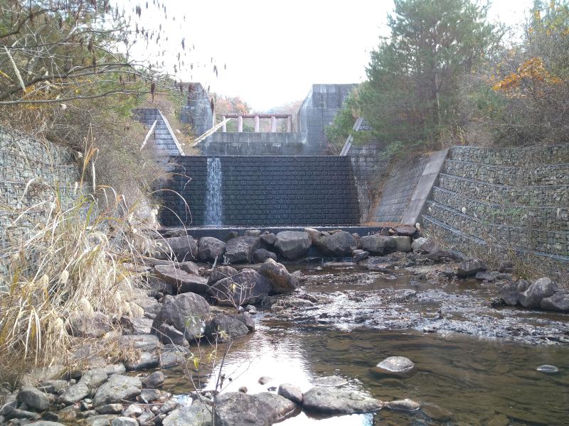 かつてはテニスクラブの駐車場を通り抜けていたようですが現在は通行禁止に。入口手前のグラウンドの下に鉄塔へ向かう道があるのでそれで沢へアプローチ。堰を越えて獣道を広い出合へ行く。