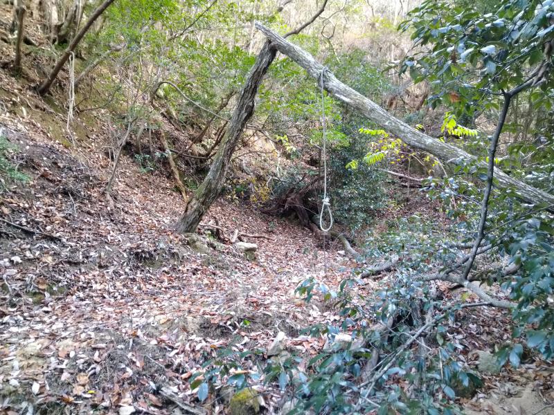 水量が少なく水は冷たいのだけど問題なく 快適に歩いているとすぐに3m程度の小滝が。その次は右岸にピラー(石塔)のある2m滝、釜の深い2m滝…釜の深い3m滝…4m滝…と続々と小滝が出てきてとても楽しい時間でした。釜滝下の大きな堰は左岸から巻いて穏やかな流れをわずかで釜滝に。…がその手前で誰かロープにいたずらをしたようで すっごいびっくり…! そのロープのくくり方は…やったらいかん…。