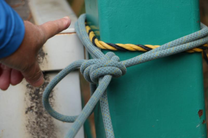 まずはヤグラにて ロープの固定 、もやい結び三種類使用での固定、フックスの張り方