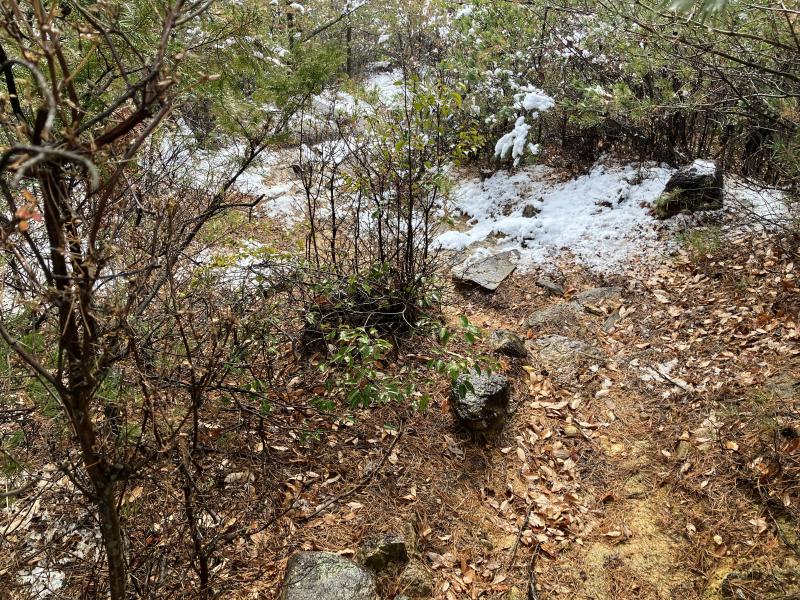 そして下山なのですが、ここからが少し大変でした。晴れてきて雪が溶けてきており、道がグズグズに。チェーンスパイクを忘れてしまい、何度か転んでズボンがびしょびしょに、、