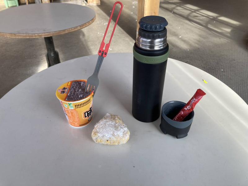 持参したおにぎりとカップ麺で朝食を食べ、