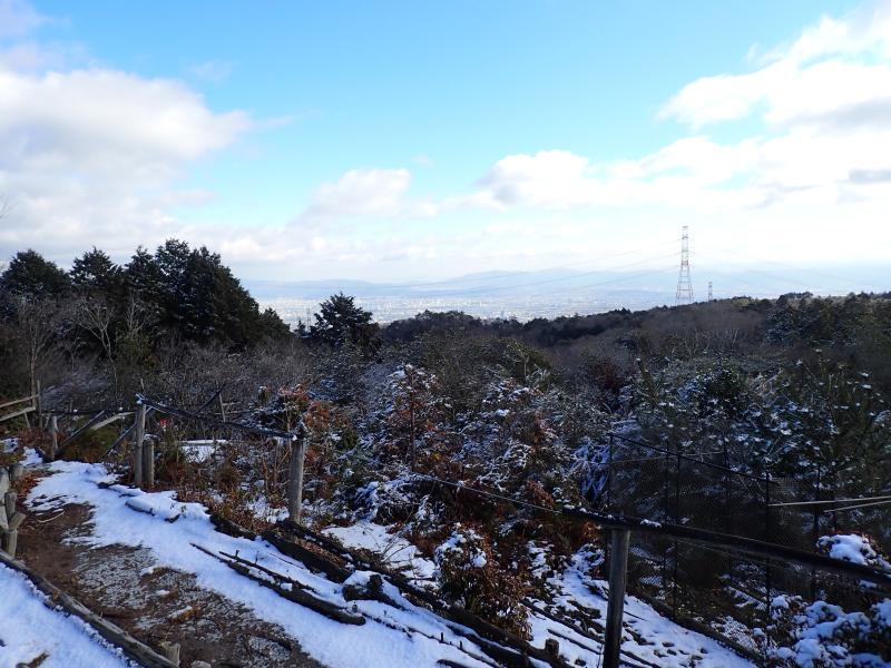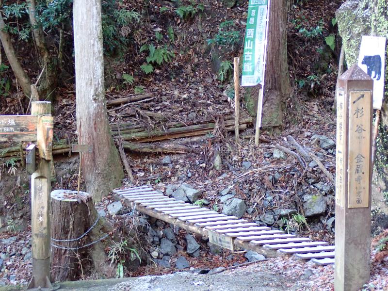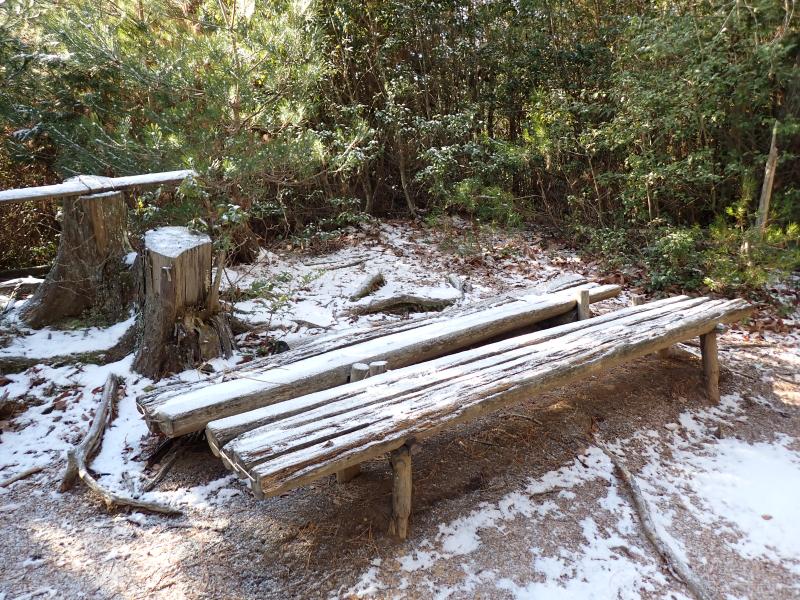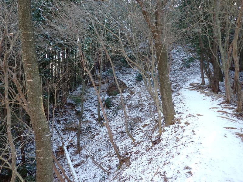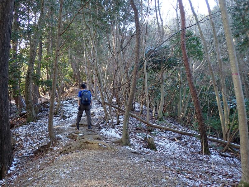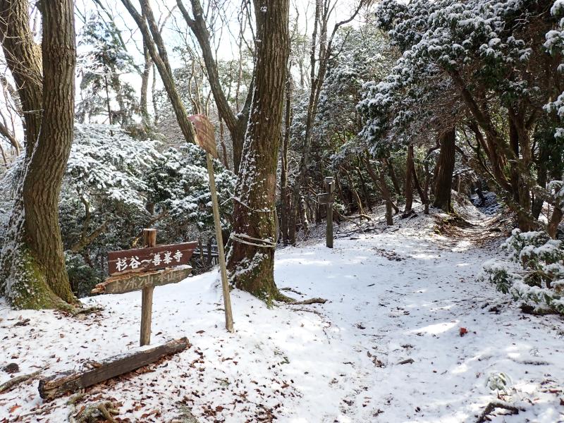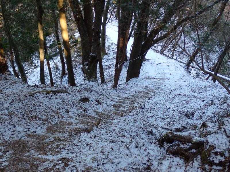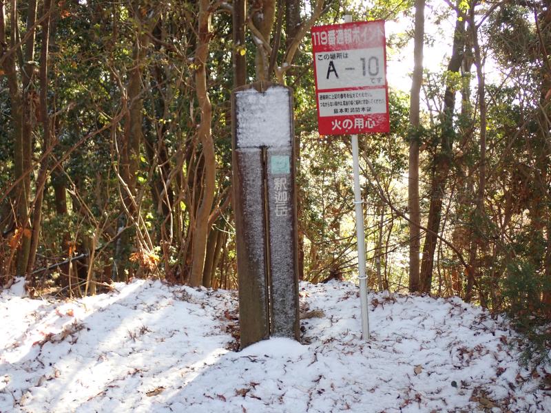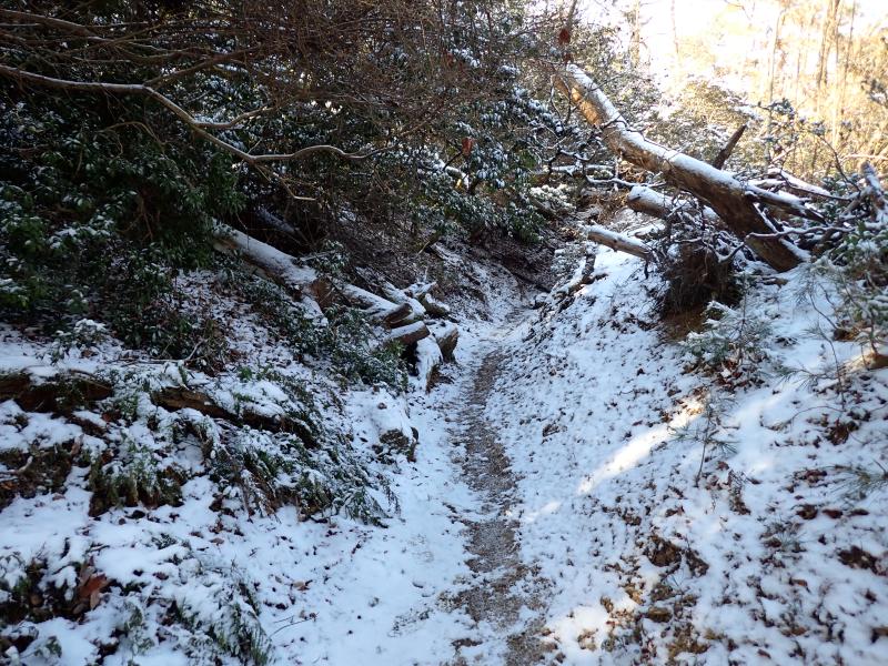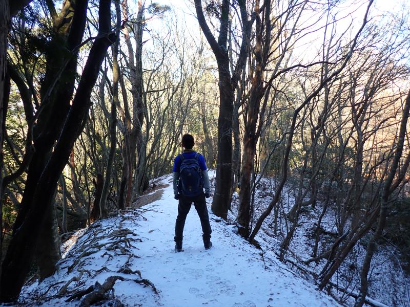 善峯寺から出発。当日は気温-1度で前日に軽い降雪があり、善峯寺への道中は路面にも薄っすら積雪がありました。入山地点の善峯古道の入口にかかる小橋は、雪が積もっていると滑りますので、ご注意ください。道なりに進んでいくと、尾根道との合流地点付近から積雪1~2cmになりました。陽当たりの悪い釈迦岳の山頂付近は積雪3cmぐらい。