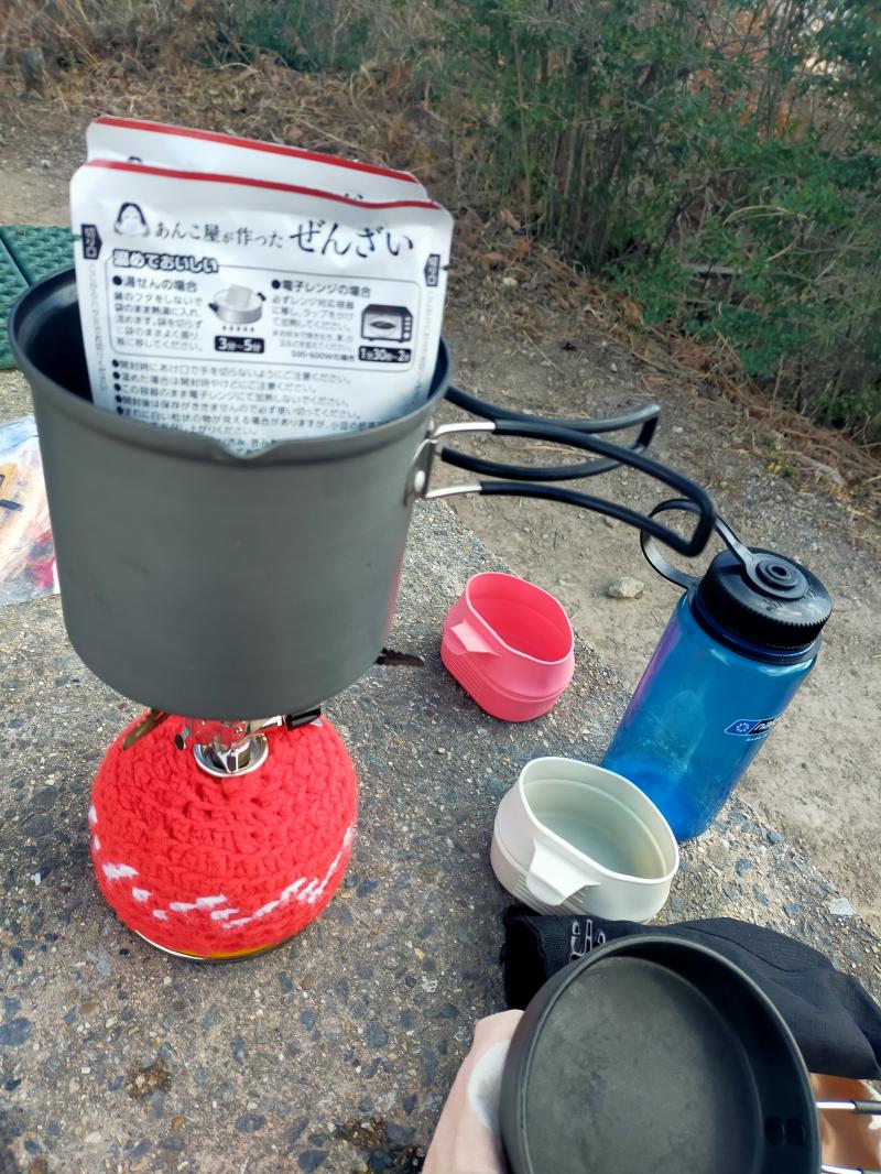 駐車場に車はたくさん止まっていましたが、スタートが遅かったため登山中にすれ違っただけで山頂では出会わず。風が良く通るので、すぐに体が冷えてきます。座布団ひいて、湯せんでぜんざいパウチを温めいただきました。