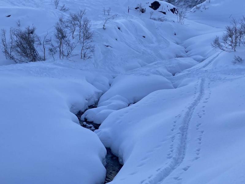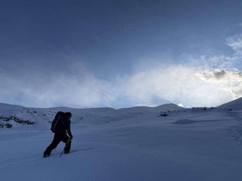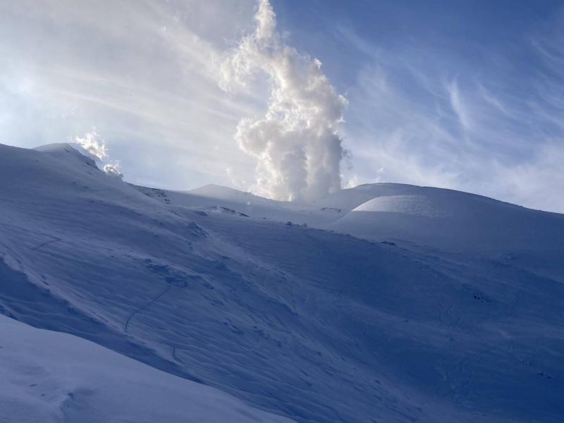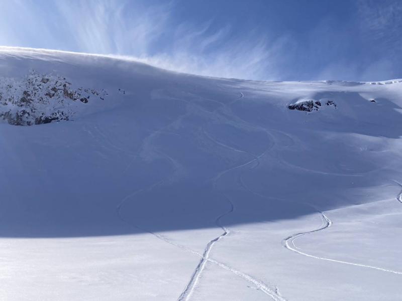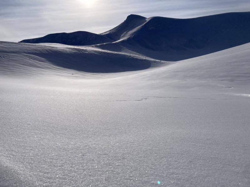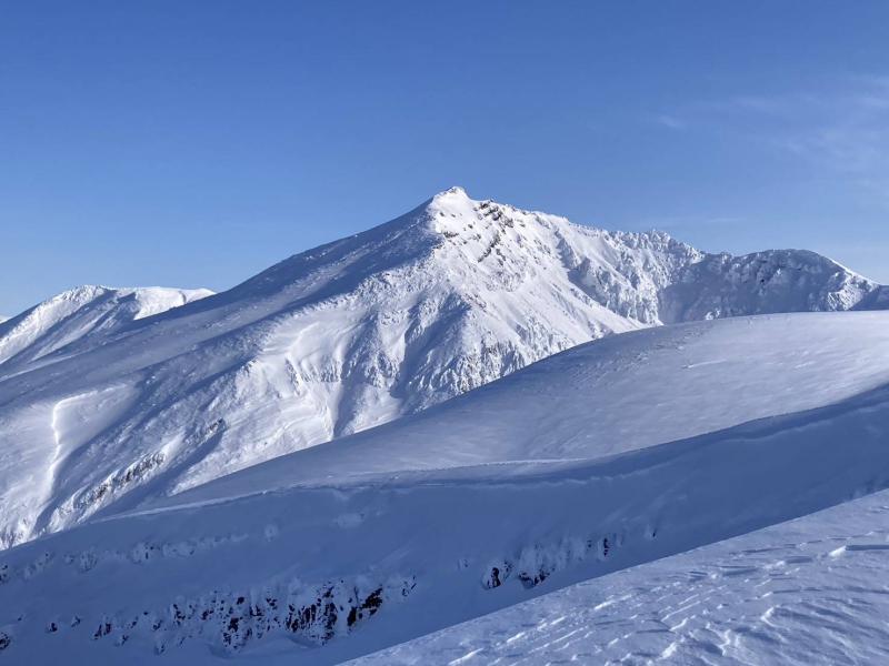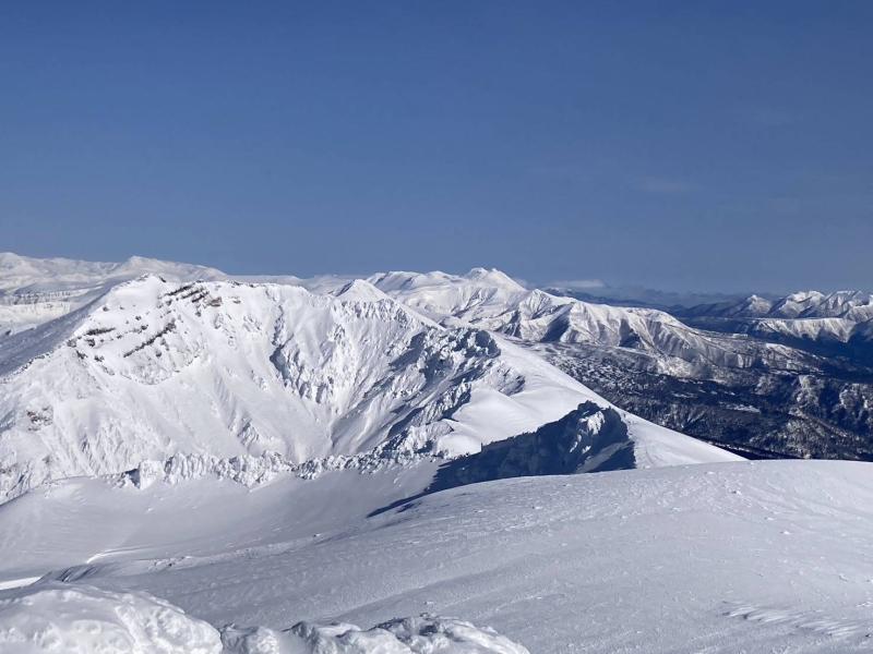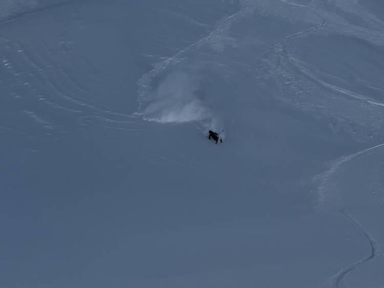 吹き溜まりの乾いたパウダースノーを堪能し、