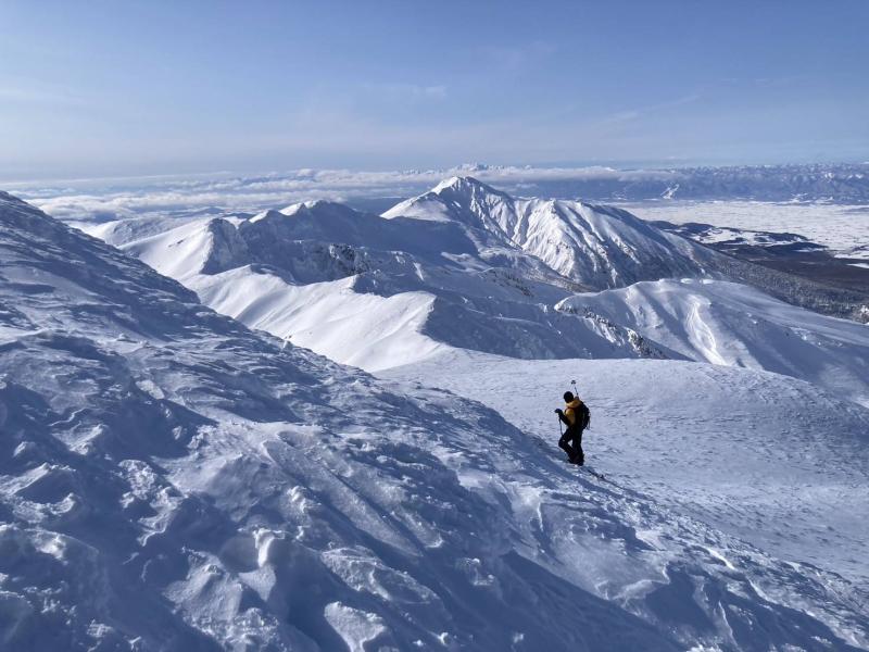 右には富良野岳、左には大雪山、振り返ると広大な大地、