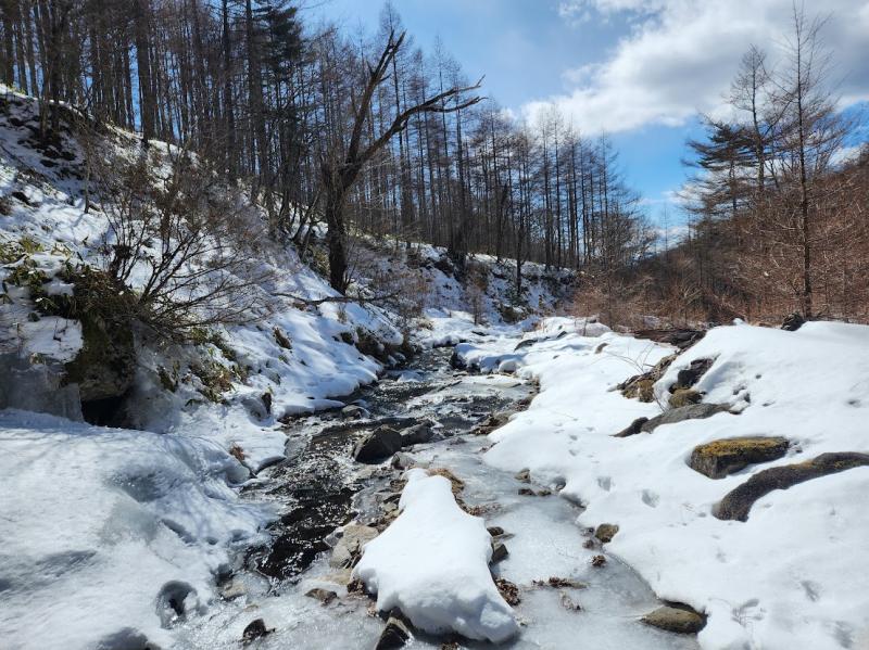 - ◯雁峠までの渡渉は数回あります。凍っている箇所もあるので滑りやすく難儀します。スパイクがあると安心です。