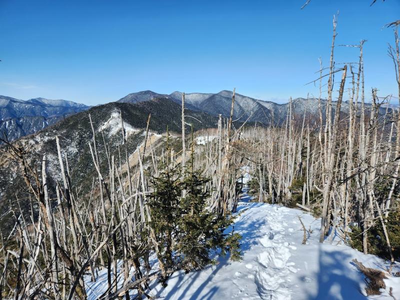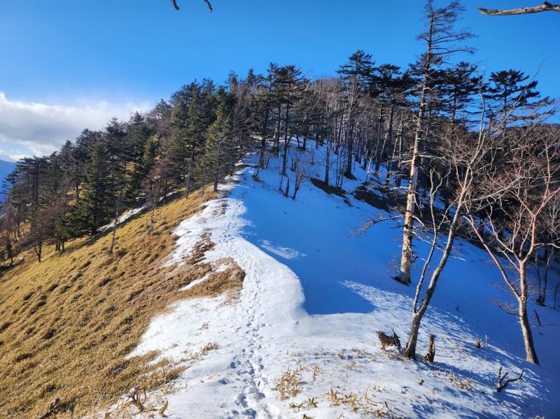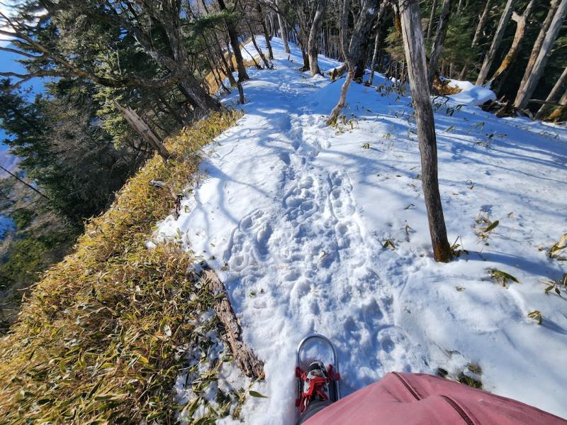 ◯雁峠から雁坂峠の稜線は雪道と夏道が交互に出てきます。ワカンが必要な雪深い場所もあります。特に稜線の東側はべったり雪が付いています。