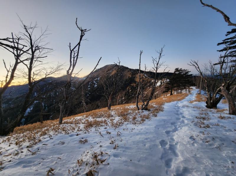 日没直前、雁坂峠手前に1張りのテントを発見。若い男性が顔を出していました。聞けば雲取から縦走中で、その日は2日目の夜営だそうな。奥秩父縦走は冬にやるのも良いかもしれません。装備は増えますが水を持たずに済むのと、蒸し暑さも無く静かな旅が出来そうです。
