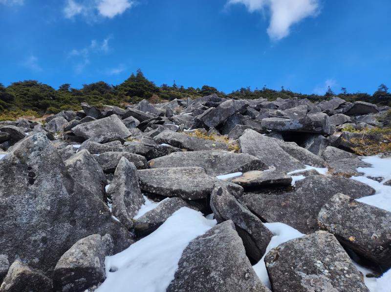 まるで八ヶ岳の編笠山の頂上部のように、ガレた岩盤が積み重なりそこだけが森林限界のごとく取り残されていました。下調べはしていましたが、いざ目の当たりにして二の足を踏んでしまいました。落ち着いて良く見ると遥か下にピンクテープと微かな踏み跡も。とてもワカンでは歩けないのでまずはアイゼンに履き替え、お湯を一杯啜ると下りる覚悟が出来ました。浮き石でないか確認しながら慎重にゆっくりと歩みを進めます。
