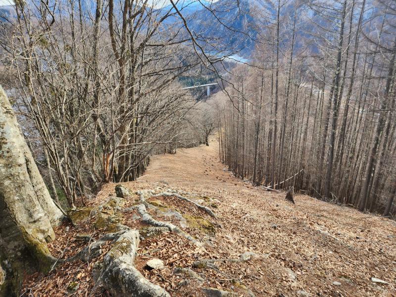 広瀬ダムが次第に大きくなるとゴールはもうすぐ。と思っていましたが、防火帯がジェットコースターのように急な軌道を下るので、ストックでブレーキをかけながらジグザグに下りました。橇やビニールシートでもあれば滑って下れるのでは?それほど急な下り坂でした。青笹尾根を登るのはかなり骨が折れそうです。一般道でないのも納得です。