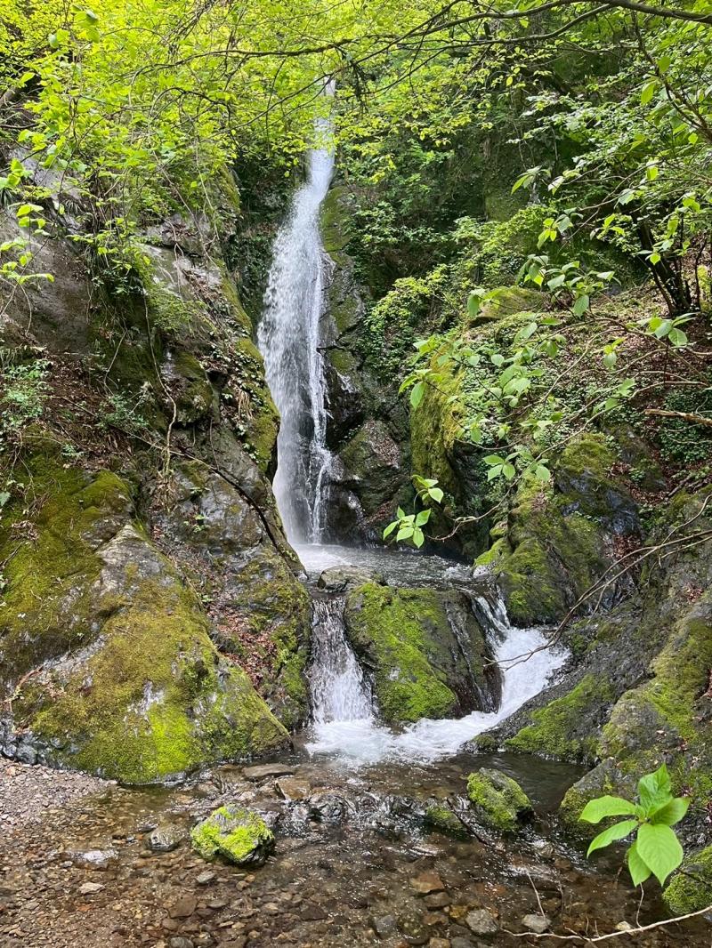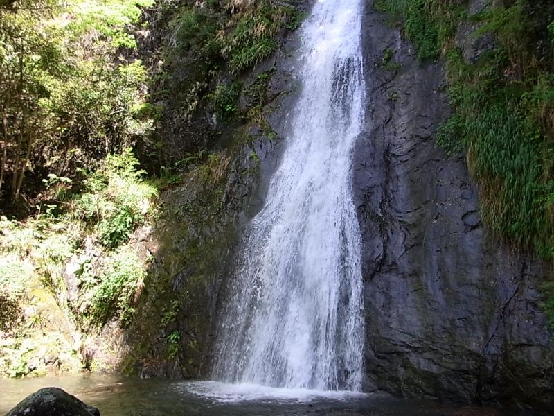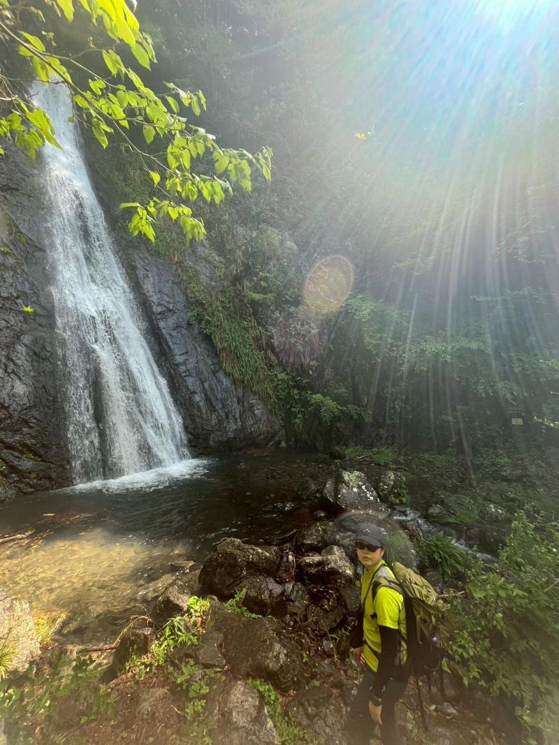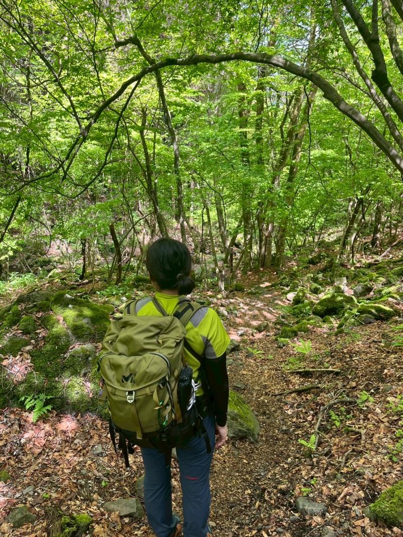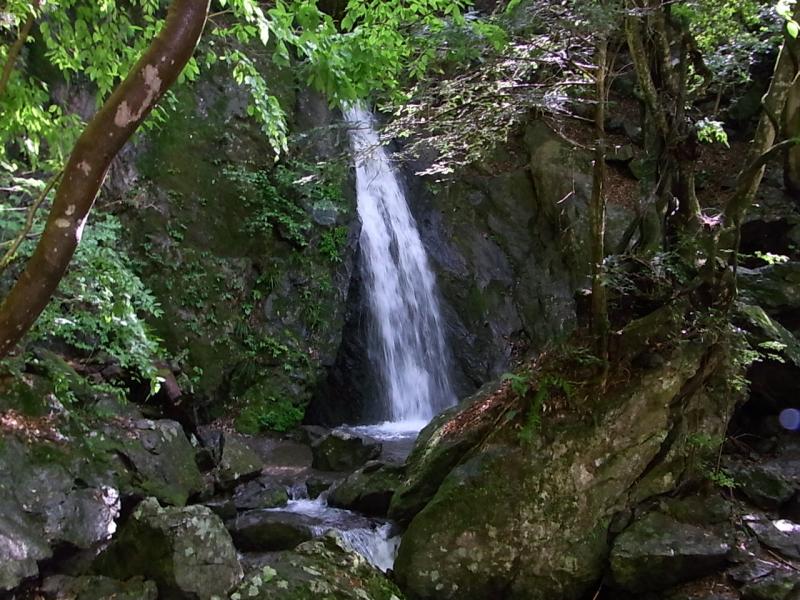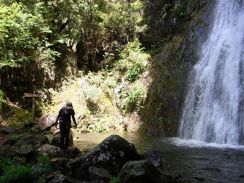 天狗の滝を横切った向こうが登山道ですが、増水していたのでジャンプして岩の上を渡るかんじになったので、小柄な人は雨の翌日に行かない方がいいと思います。わたしも友人も身長が高い方なので問題ありませんでしたが、なかなかの水量でした。