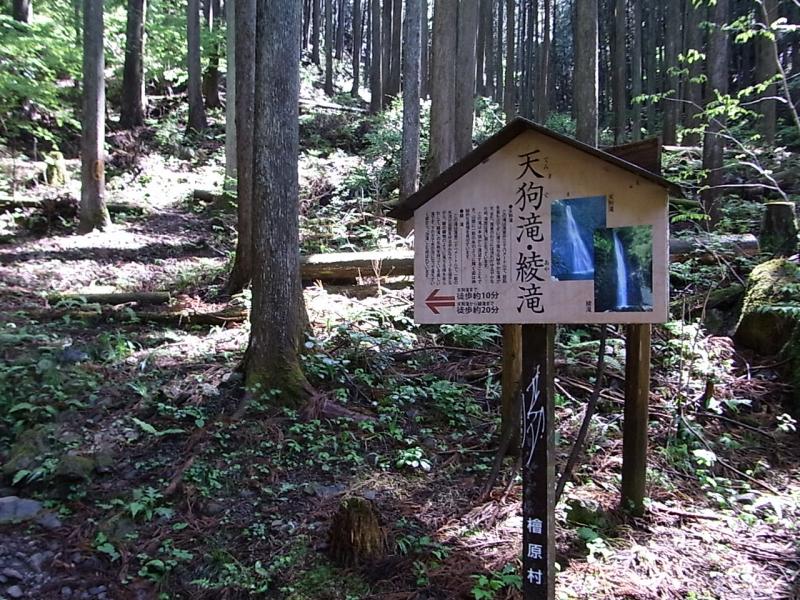 本来のコースでは武蔵五日市駅からバスで払沢の滝まで行くのですが、今回時間があまりなかったので千足バス停からスタートしました。バス停から商店の先を右に進んで神社を過ぎると山道に入り、分岐を左に進むと天狗の滝です。まず小天狗があり、その左を登っていくと天狗の滝が見えてきます。天狗の滝へ下る道は少し歩きにくいので慎重に歩いたほうがいいです。この日は前日の大雨で増水していて、濡れていて滑りやすかったということもありますが、滝の周辺はどこも急な道が多いので油断しないほうがいいでしょう。