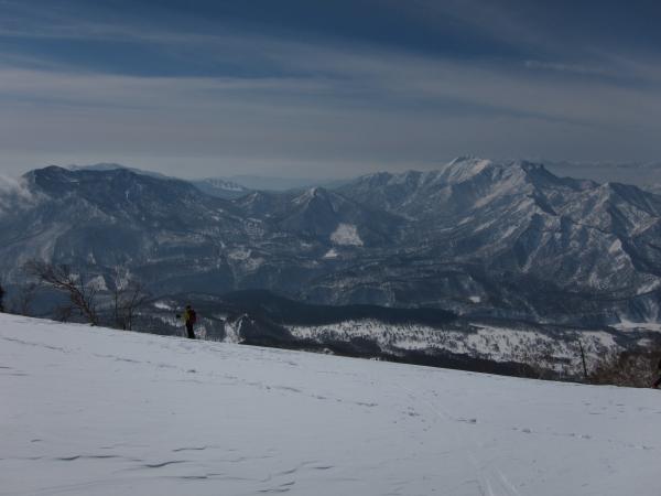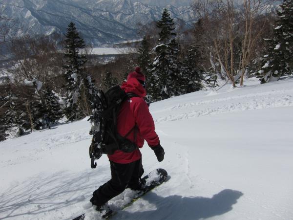 ゲレンデトップから南側の展望が開けた斜面をハイクアップ