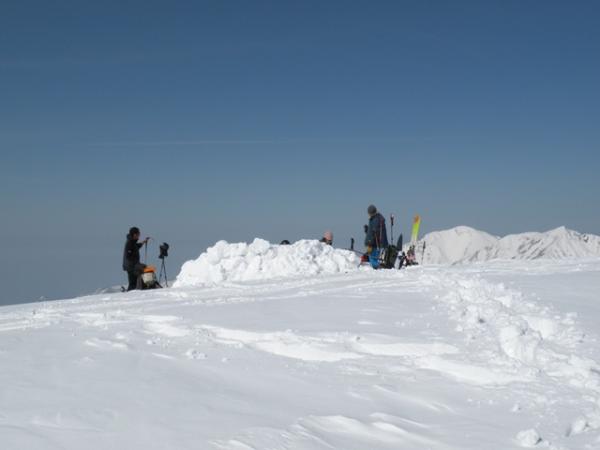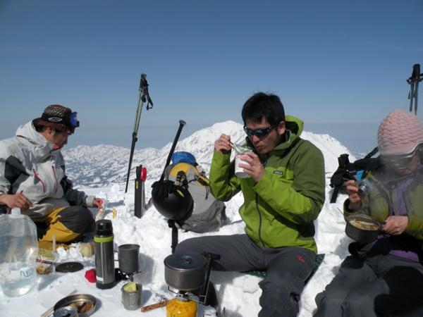 放山をさらに進んで1つ先のピークまで登り、スコップで雪を積んで風よけとテーブルをつくり