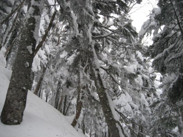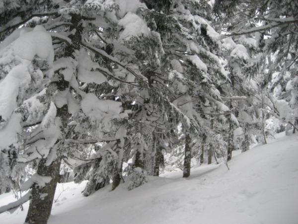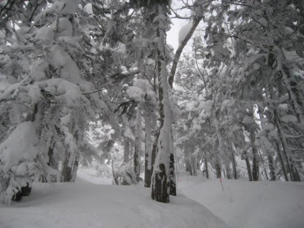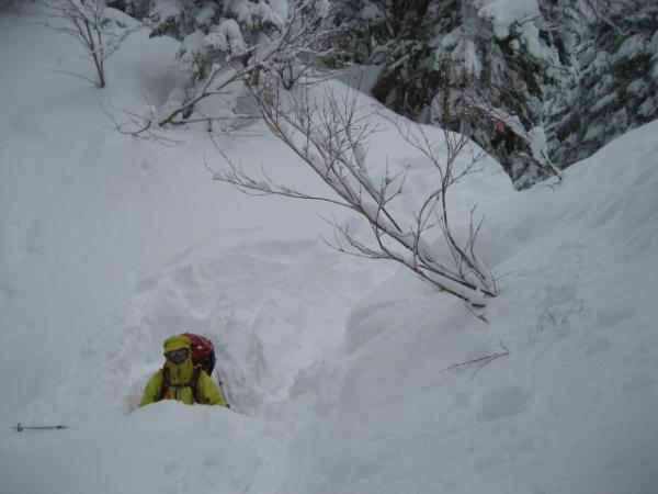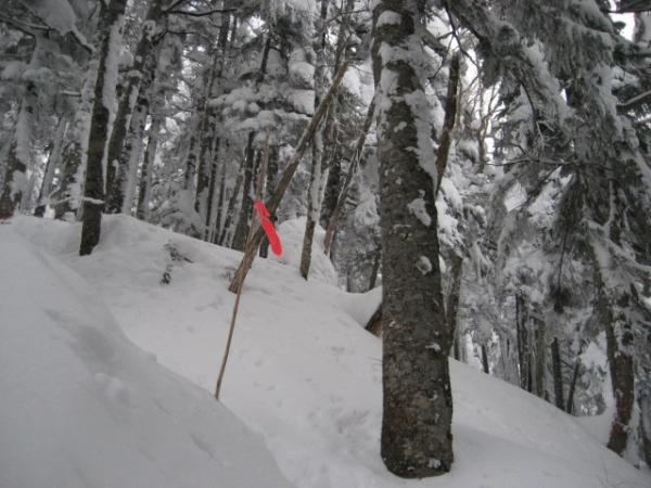行きは小屋の方が目印の旗を整備しながら前を歩いてくれたので、ひざ下くらいのラッセルでまだまだマシでしたが、帰りはひざ上まですぐに埋まるぐらいでした。トレースも消えて…