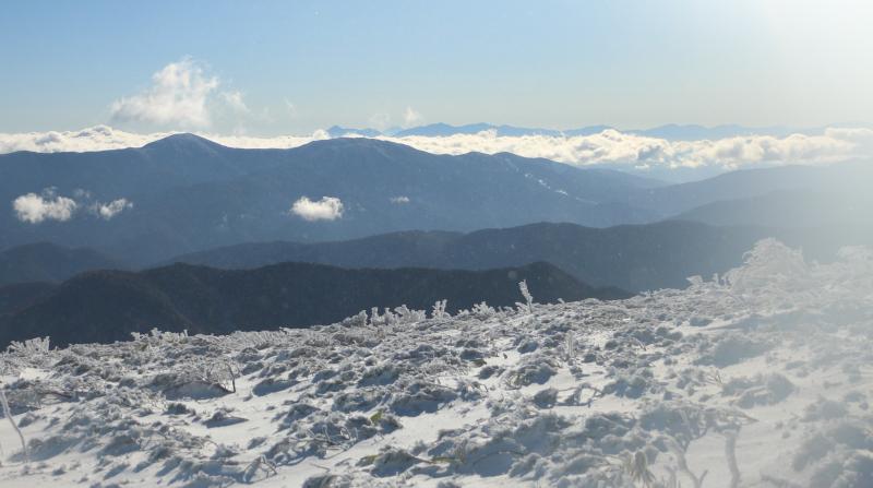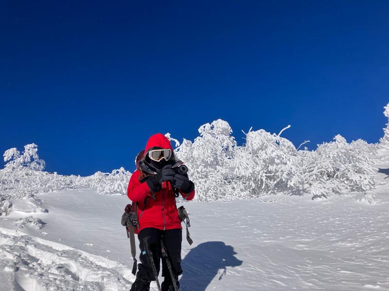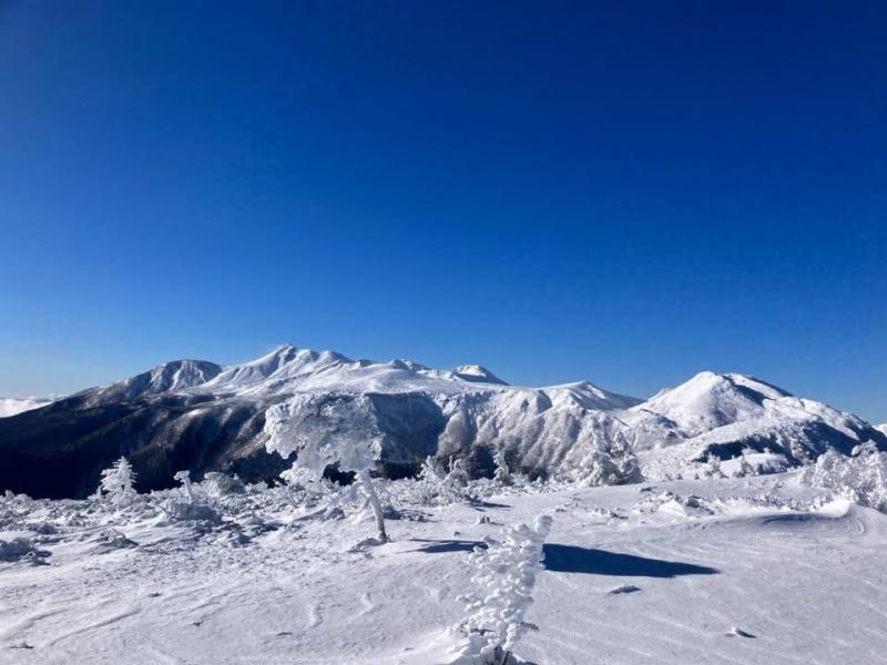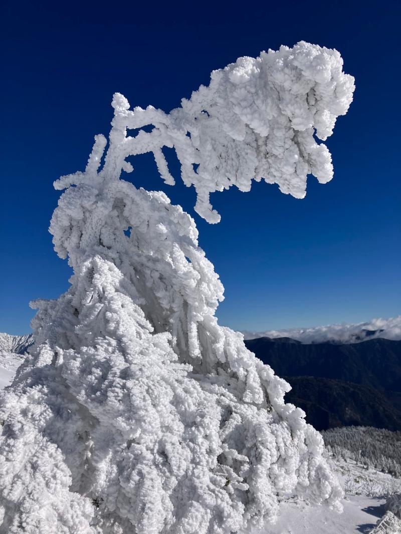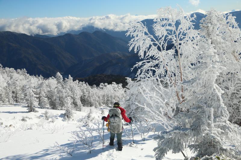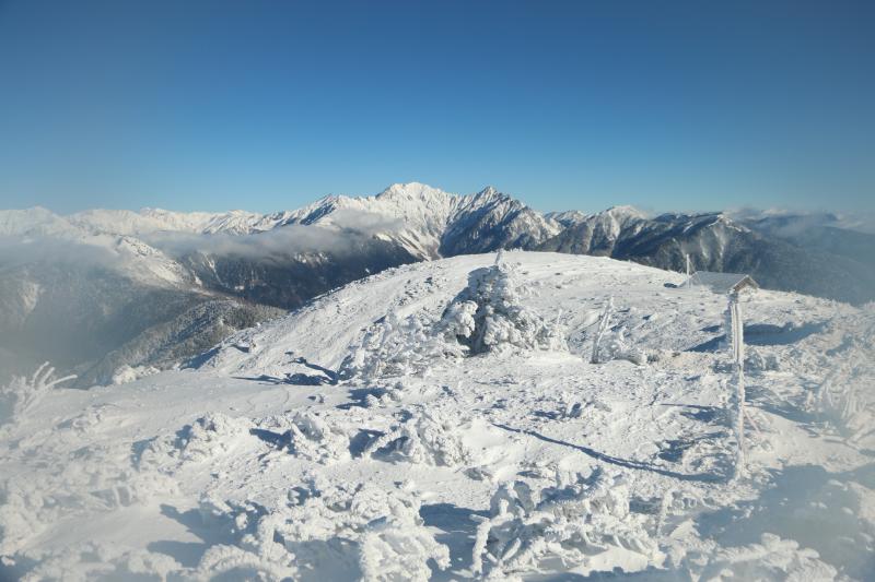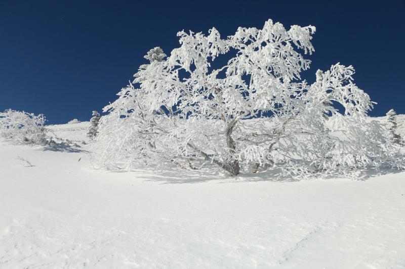 二日目 晴れ、稜線爆風。 大展望いただけました。腰までラッセルでした。一日で降雪50CM位? 樹林帯で 150CM 積雪 吹き溜まりは200CM位 です。