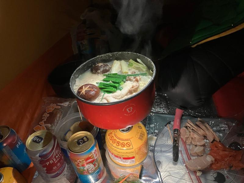 翌朝は前日の鍋に、野菜とお肉を足した豪華ラーメン、エスプレッソの豆でドリップ珈琲と山梨の柿のデザートでした。