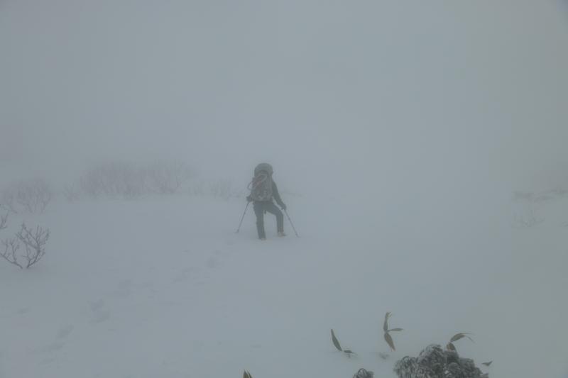 稜線ホワイトアウト 風速20M 避難小屋も見えなかったです。