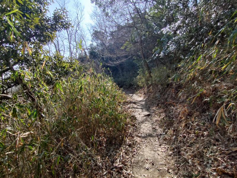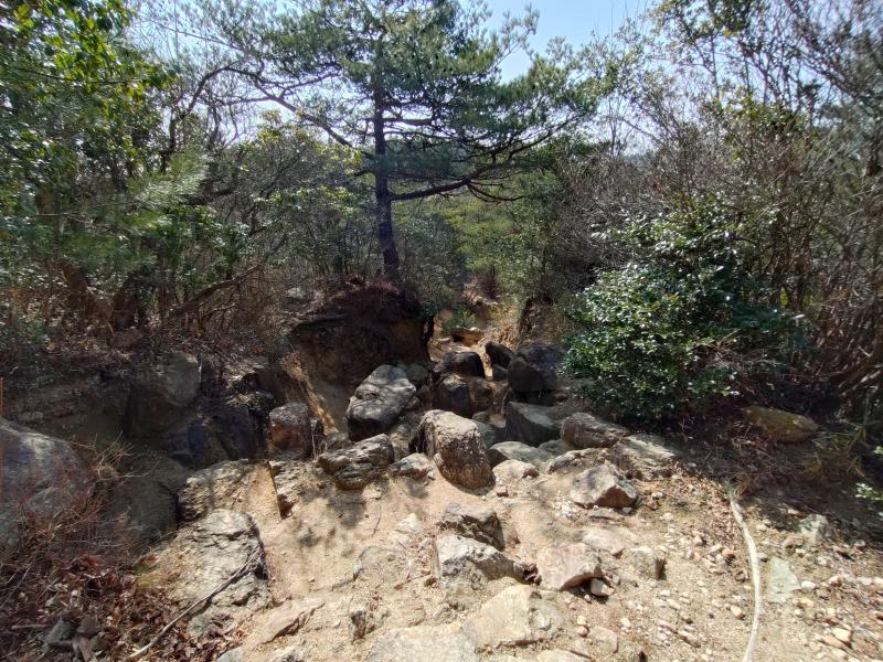 風吹岩に到着すると、次は金鳥山を経て保久良梅林に下山していきます。下山開始後すぐに足元に大きな岩がごろごろと続く箇所がわずかにありますので慎重に足を運びます。金鳥山から保久良梅林に到着すると見事な梅林が目の前に広がっていました。