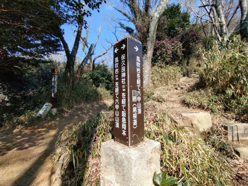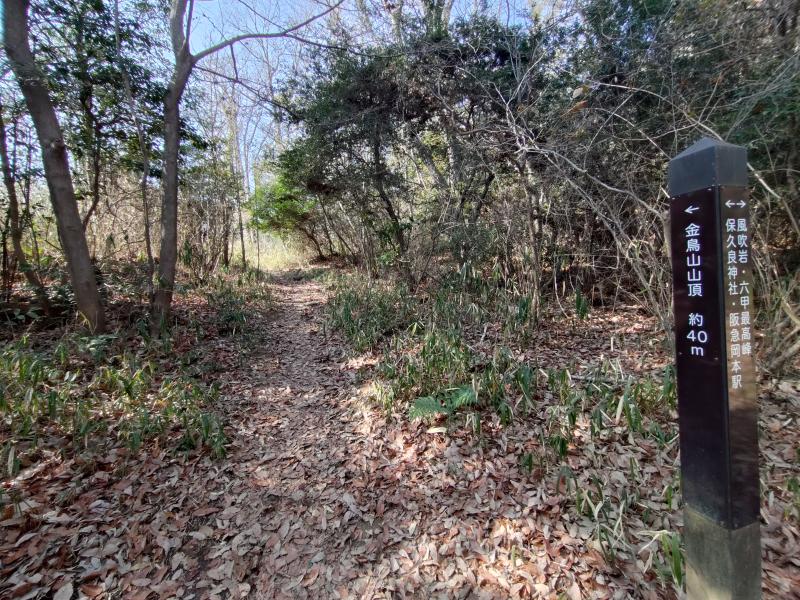 - 阪急・芦屋川駅→(40分)→高座ノ滝→(45分)→風吹岩(437m)→(30分)→金鳥山(338m)→(20分)→保久良梅林→(25分)→阪急・岡本駅