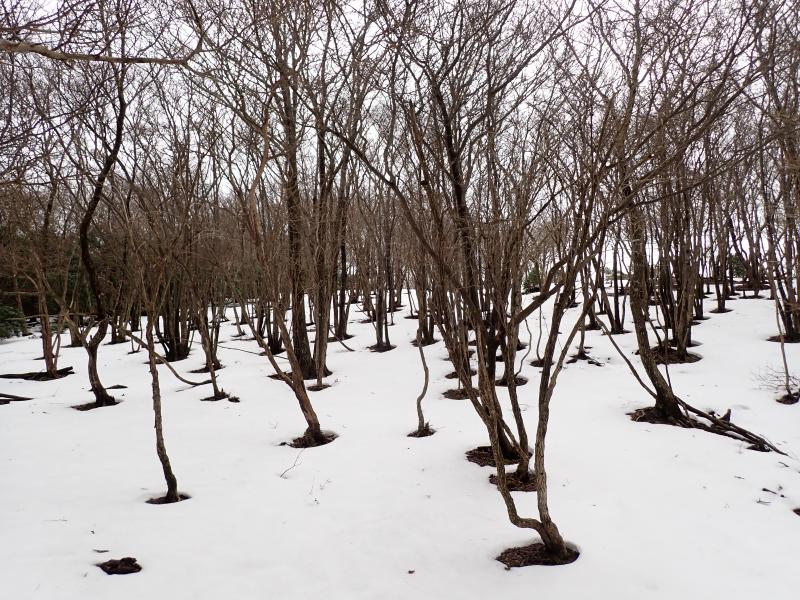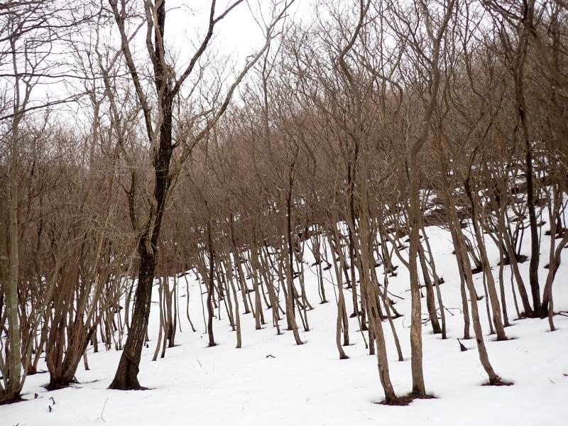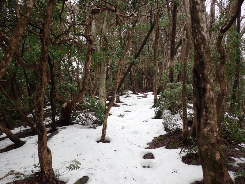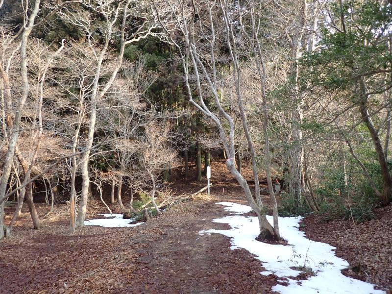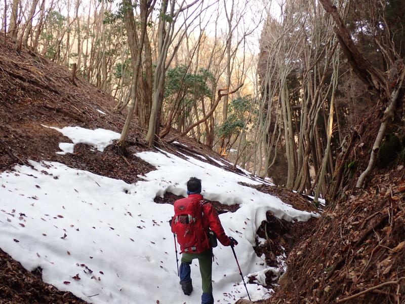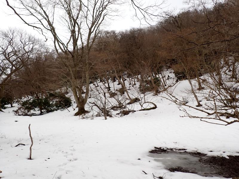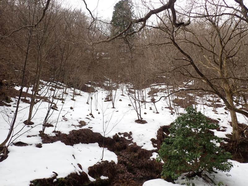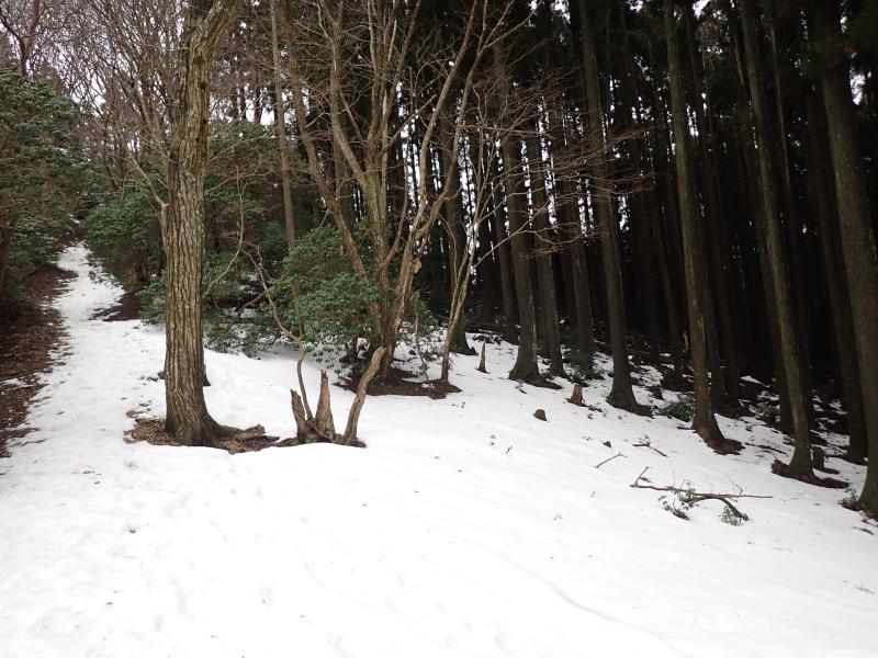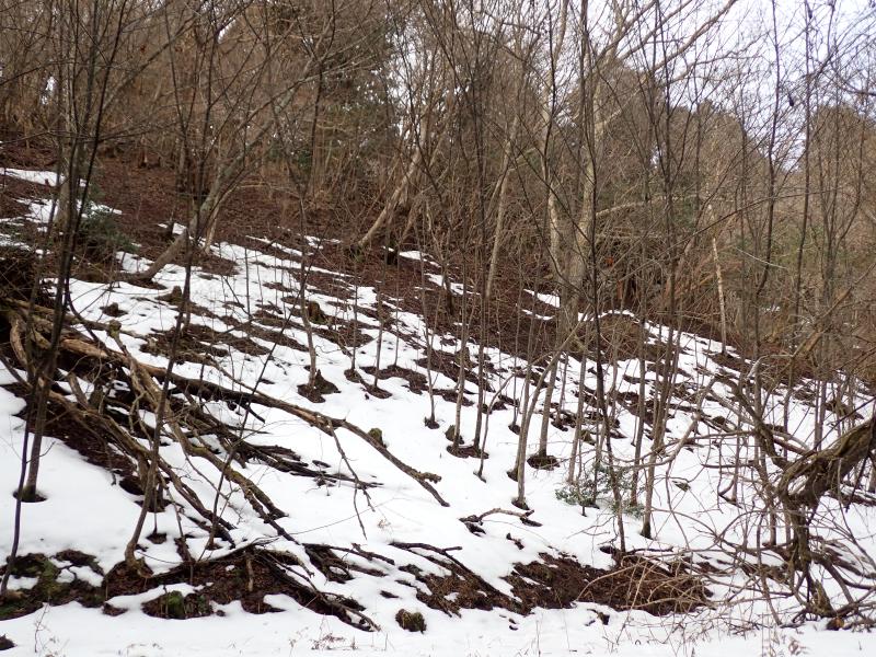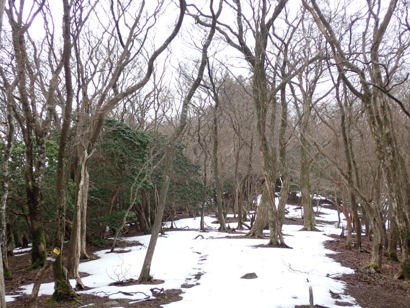 首無し地蔵のあるサカサマ峠まで、部分的に残ってはいるもののほとんど雪なし。先週の雪が湿雪だったので、その後の気温上昇で溶けてしまったようです。龍の小屋付近まで来ると、それなりに積もっていました。