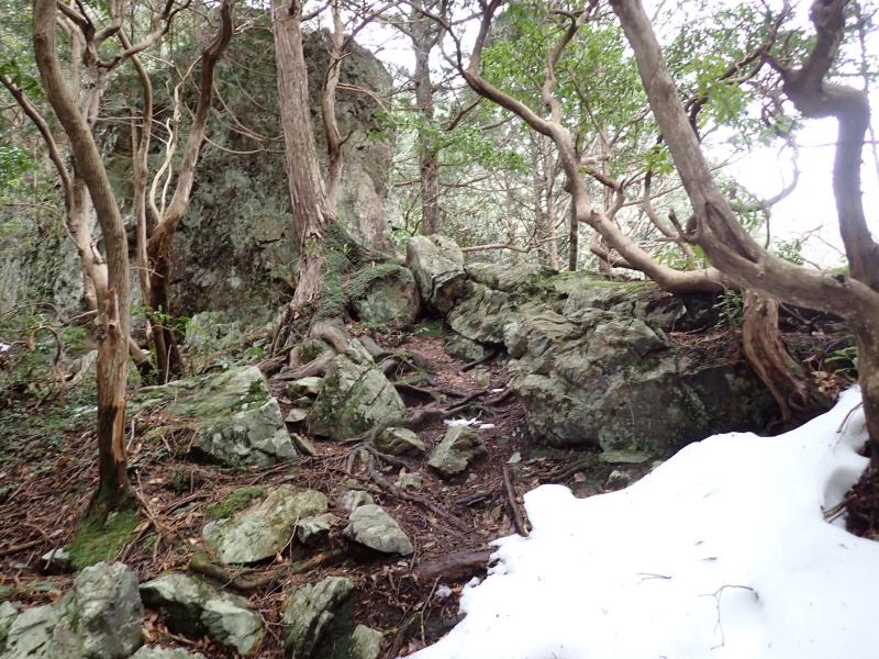 龍の小屋から竜ヶ岳への急登は、知る人ぞ知るかなりの難所です。足場の悪い岩場の登攀と急傾斜の山道であり、木の根を掴んで地面を這うようにして1時間近く登ります。幸いにして今回は雪がほとんどなかったですが、積雪がある場合は要注意です。このルートは上級者向け、下るならロープがある方が良いです。