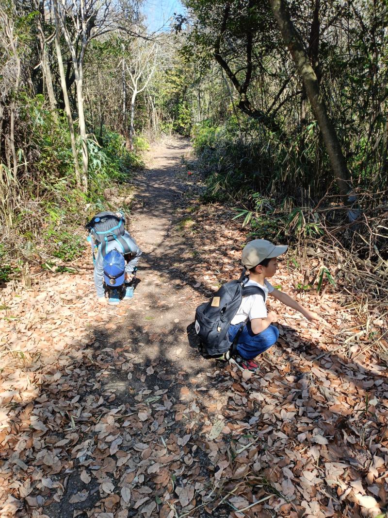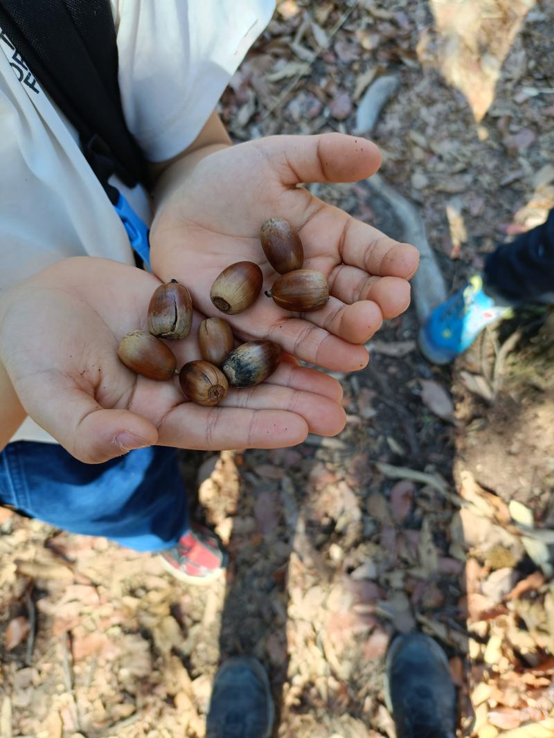 途中でドングリを山頂から投げる目的でドングリ集め。