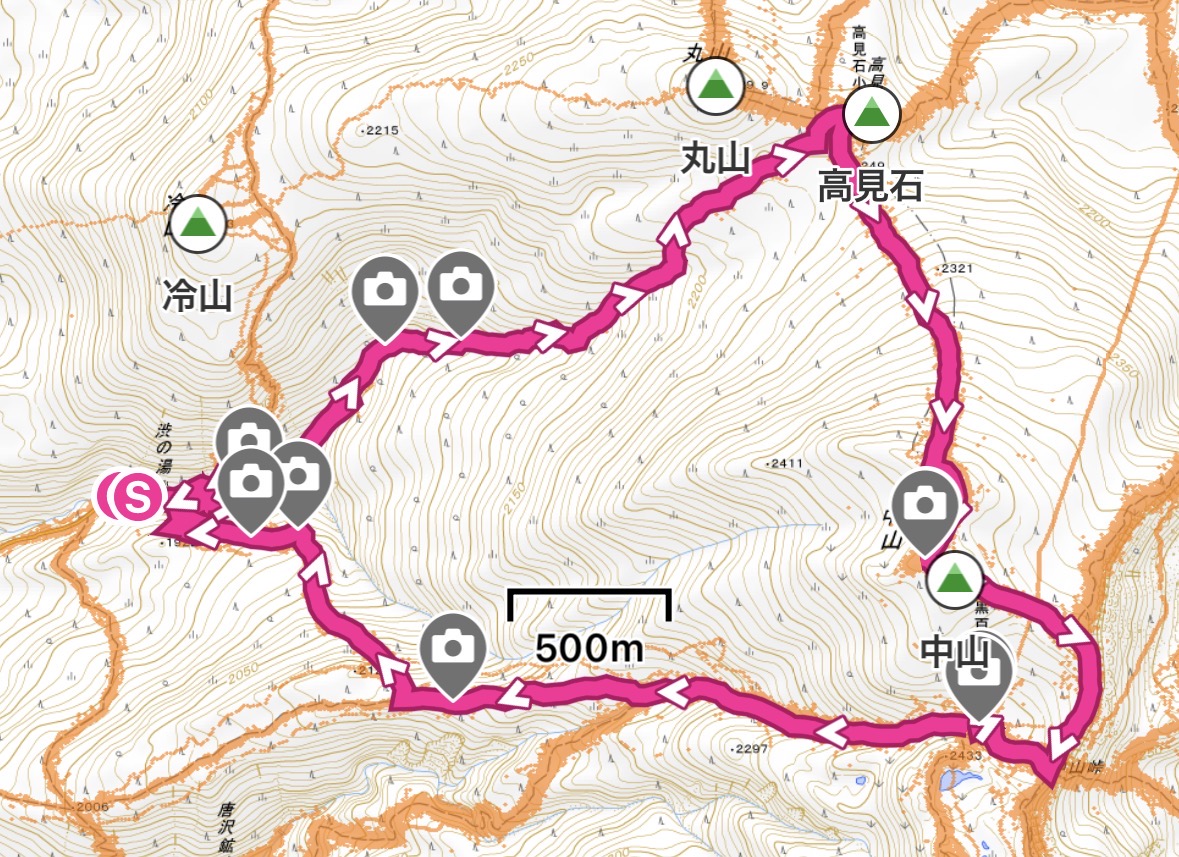 - 渋御殿湯-120-河原地蔵-25-高見石小屋-7-高見石-7-高見石小屋-50-中山展望台-2-中山