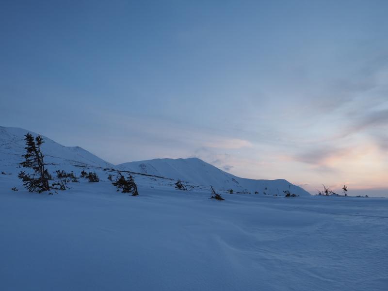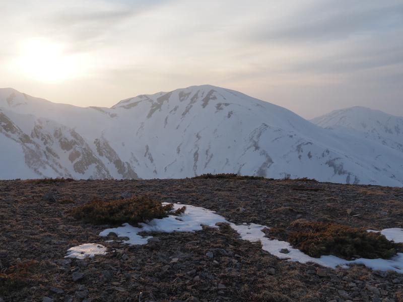 少し天狗原で休んでから白馬乗鞍岳への急斜面へ。1歩進んでは沈むので体力消耗します。こういう時はスキーの沈まなさが羨ましい。やっと白馬乗鞍岳に到着。白馬岳も見えてますね。白馬大池はまだ雪の中、少しだけ白馬大池山荘の赤屋根が見えています。テントを張っていたと思われる場所にヤドカリして整地して少し壁作ってテント設営。水を作りちょっと昼寝してから、夕方に少し登り雪倉岳・朝日岳方面を見に。ちょっと雲が多めで夕焼けは綺麗には見えずでしたが雪倉岳・朝日岳はよく見えていました。