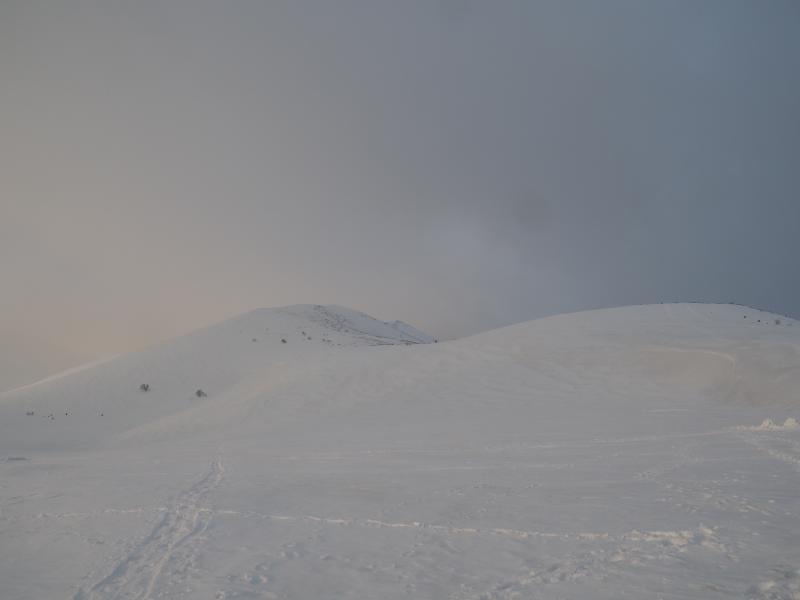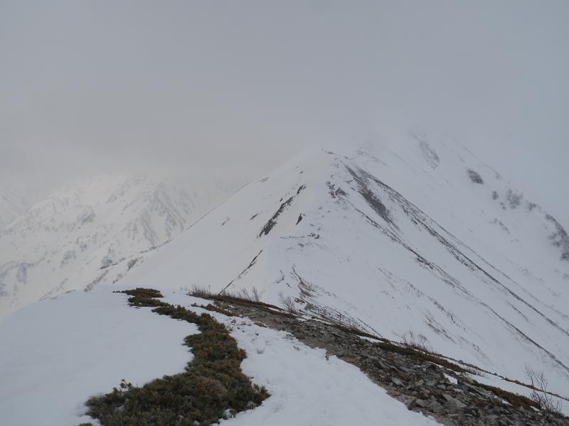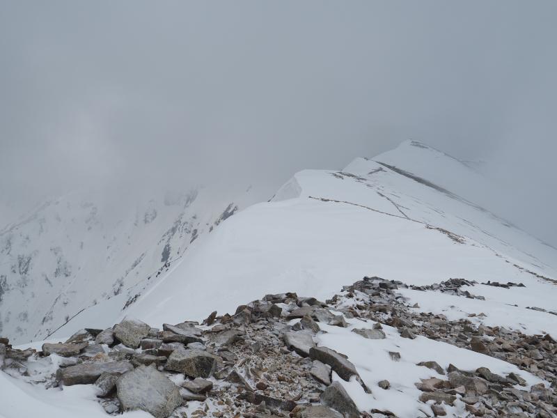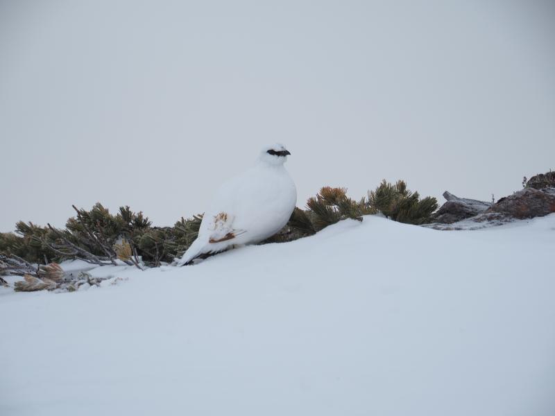 夜中は風が強まり、雲も多く星空撮影はできませんでした。朝方はパラパラと雪も降ってきたりと、寝たり起きたりしながら夜を過ごし4:30頃出発するつもりでしたが寝坊し。。。6:00出発。すでに日が出てしまいましたが稜線はガス多めですね。船越ノ頭に着いてもまだガスは取れずですがとりあえず小蓮華山を目指します。稜線は所々クラックがあります。雷鳥発見!久々の冬毛雷鳥、可愛いですね。ガスが濃くなってきてホワイトアウトしそうですがやっと小蓮華山に到着。しかし白馬岳は全然見えない。。。時間的にはまだ余裕はありますが微妙な天候なので戻りますか。下ってきて途中振り返ると上空に青空が!晴れるタイミングが。。。テント撤収、パッキングし直して下山開始します。