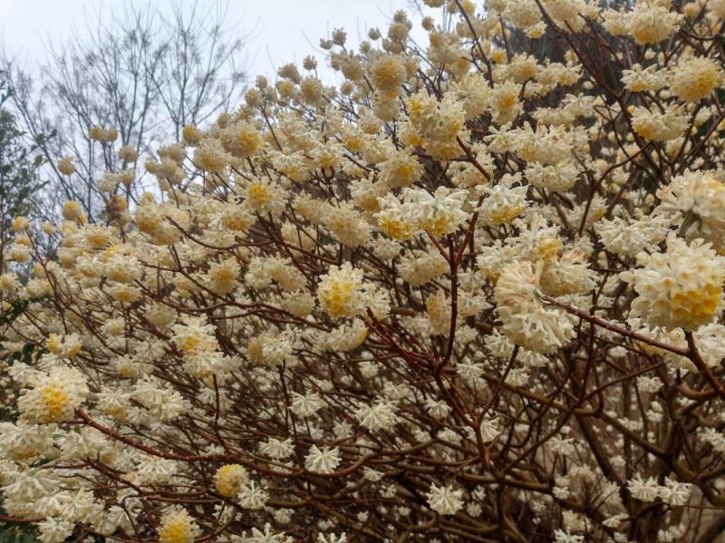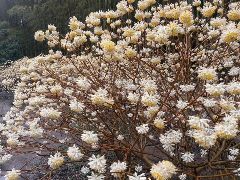- 小雨で滑りやすい。 ミツマタは満開でした。