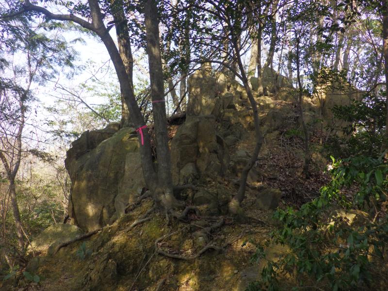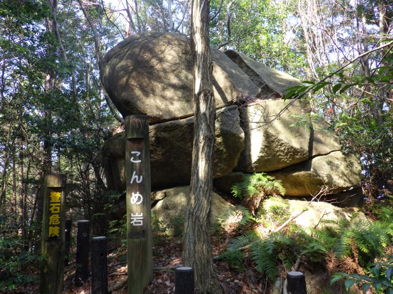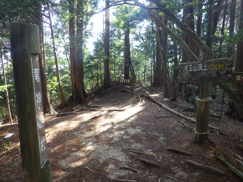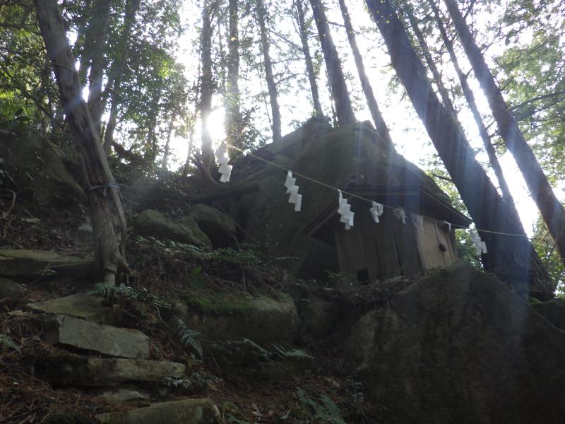 あえんぼ広場入口からはやっと登山道らしくなってきて、道も細く、傾斜もやや強くなります。山頂直下には竜王宮があり、雨の神・水の神ともいわれる八大竜王の一つ摩耶斯竜神がまつられています。ひっそりとした空間に巨大な岩盤が折り重なるように岩が覆いかぶさった竜王宮の磐座、白い結界も貼られ、なかなか雰囲気のある場所です。