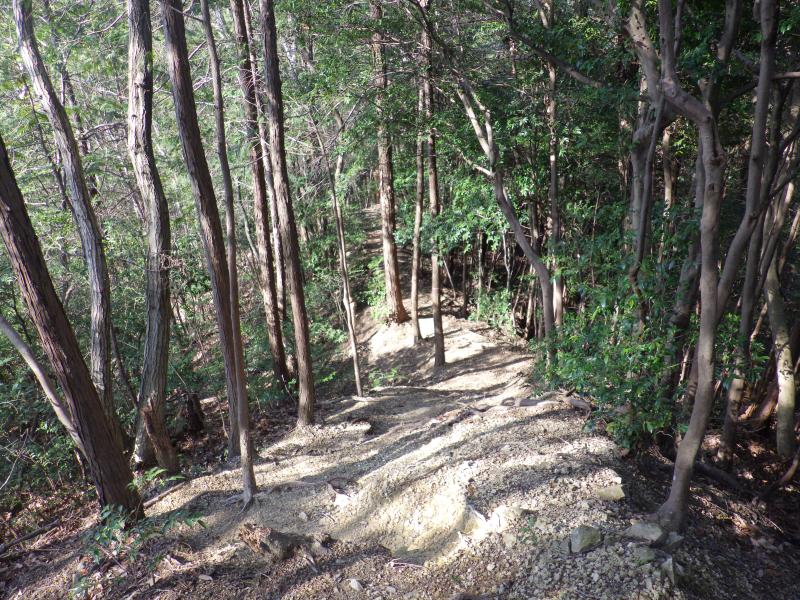 ここから折り返し、星ヶ埼城(星ヶ峰)へと進みます。登山道が大きく変わり、小刻みなアップダウン、小ピーク、小峠と何度も繰り返し、なかなか骨が折れます。星ヶ埼城(星ヶ峰)近くになると城跡だけによけいに道が荒れてきます。この星ヶ埼城も切り開きがあり、展望がよく、八幡山やその向こうの琵琶湖も見えます。城跡ですが、よくある堀切とかはなく、石垣が目立ちます。この先は一気に道の駅まで急降下していき、気が付けば道の駅の裏にでました。
