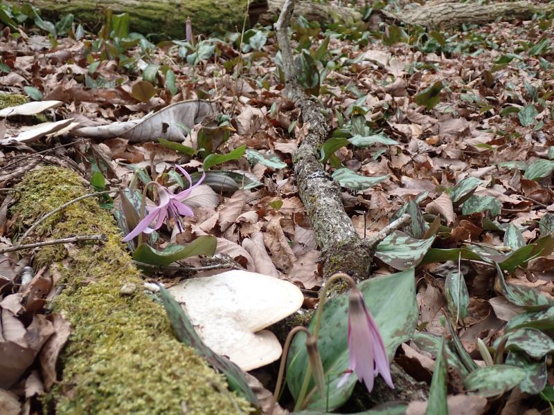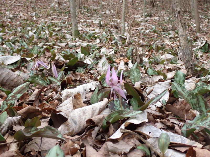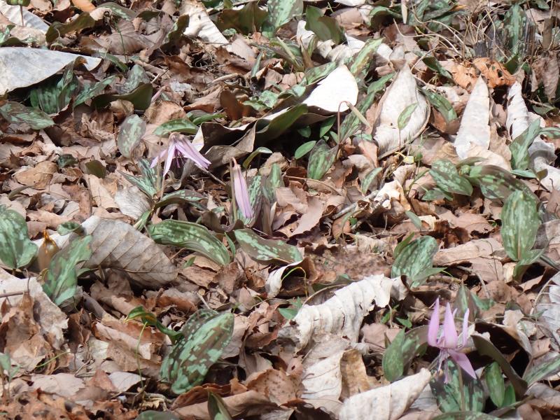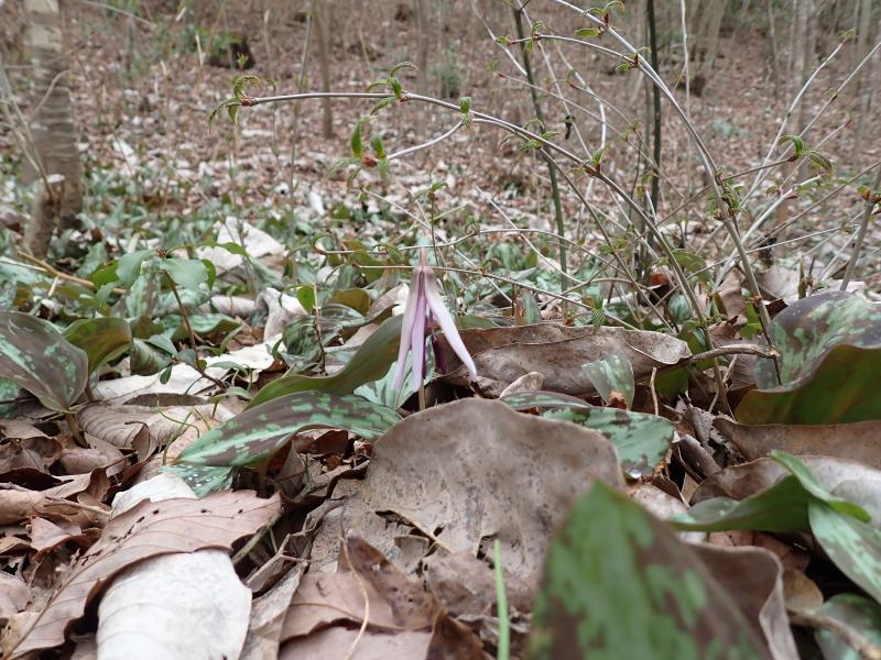 山頂への道中、カタクリの群生地を覗いてみましたが、まだまだ開花には早いようで数株が咲いているだけでした。例年通り、四月中旬頃に見ごろを迎えそうです。