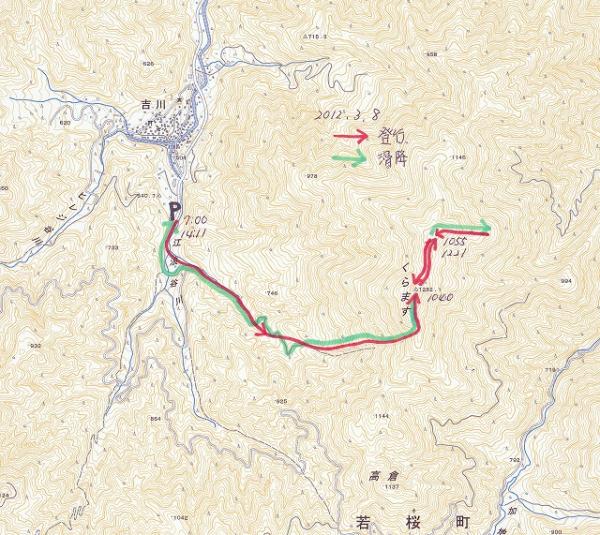 - 吉川のはずれ・除雪終了点発7:00→くらます山頂10:40→北のピーク着10:55