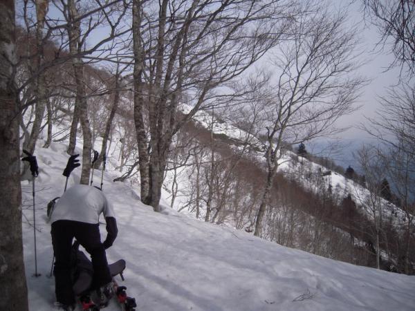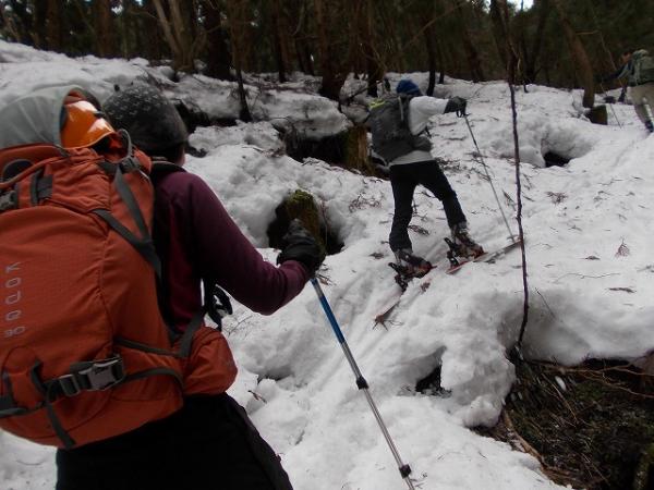谷筋を通り雪の多い西面から尾根を目指しますが、傾斜が急で、樹木も多くここが一番の