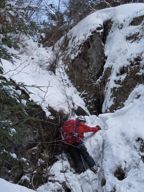 - 霞沢岳・中千丈沢のアプローチが非常に悪く、フィックスロープの登高をする箇所で、アッセンダーを持っていなかったため無理を押して行くのは危険との判断で引き返しました。沢ではわかんorスノーシューがないと辛いです。