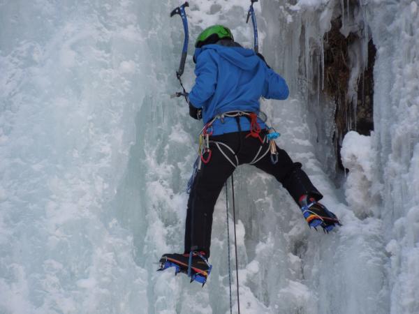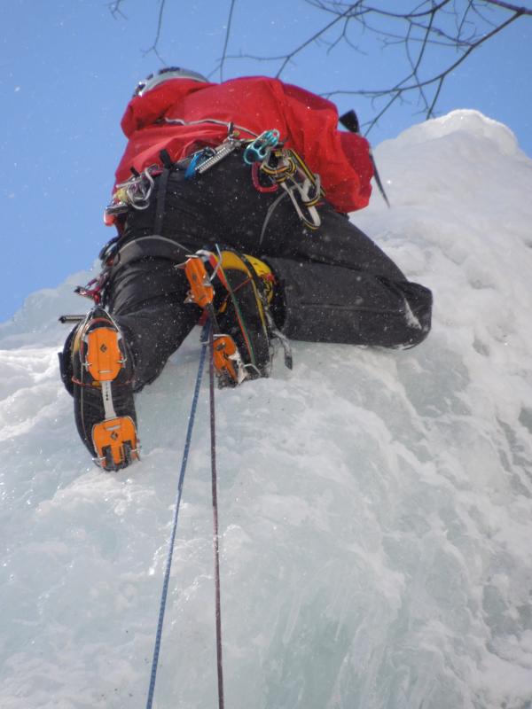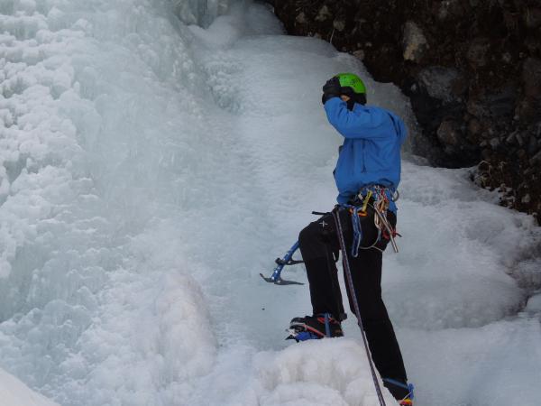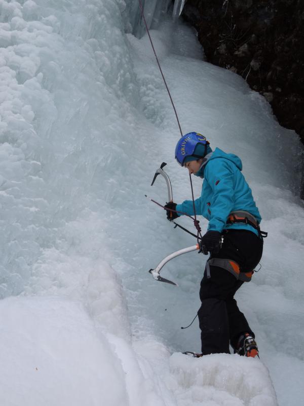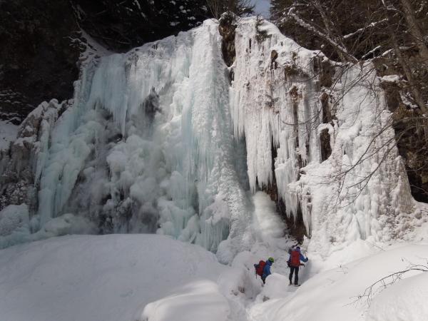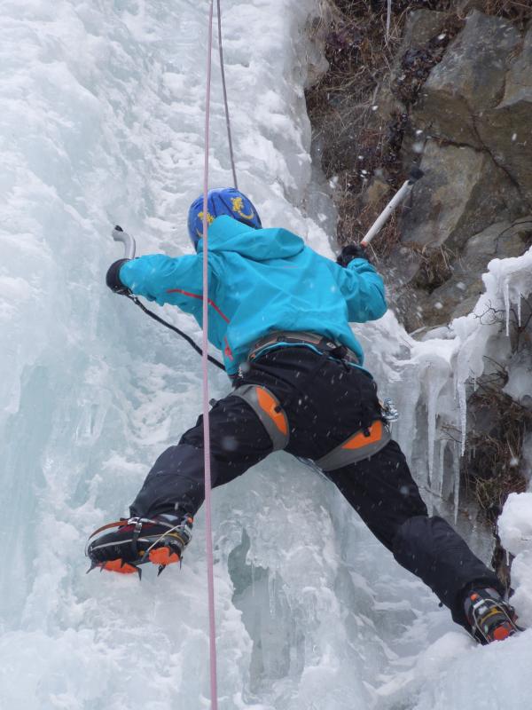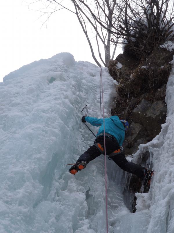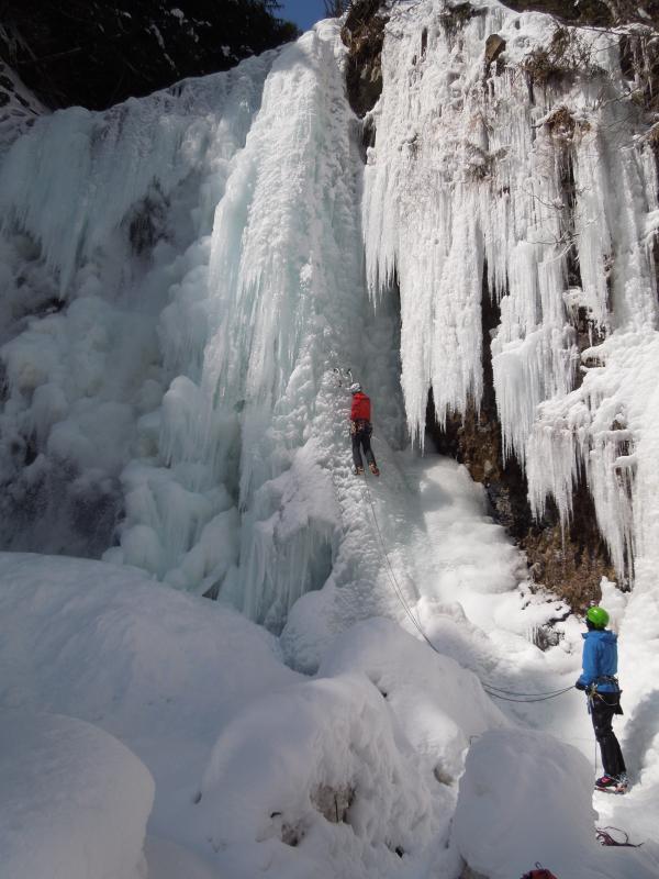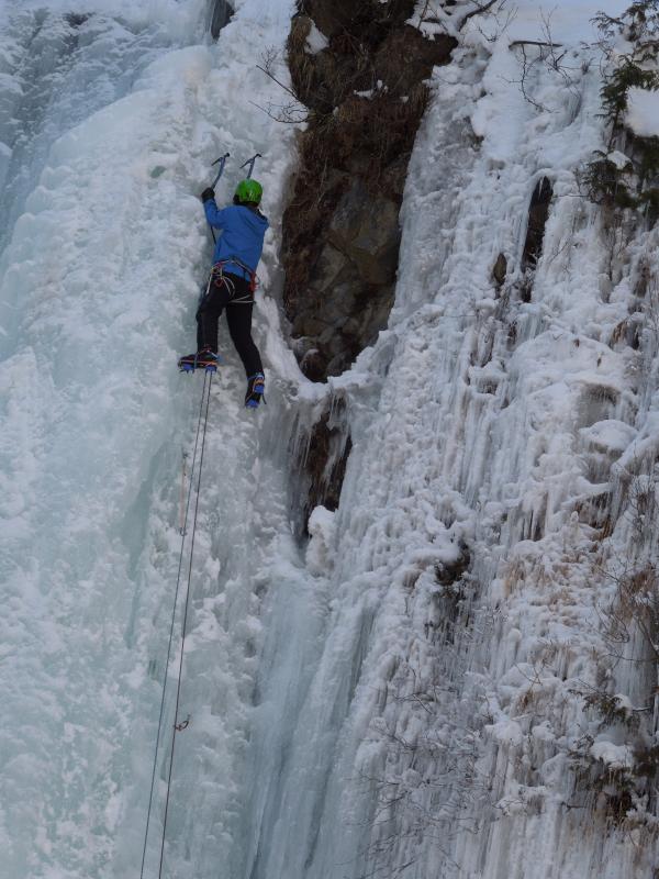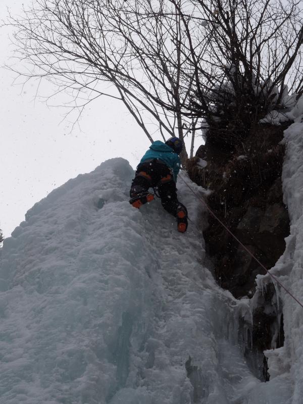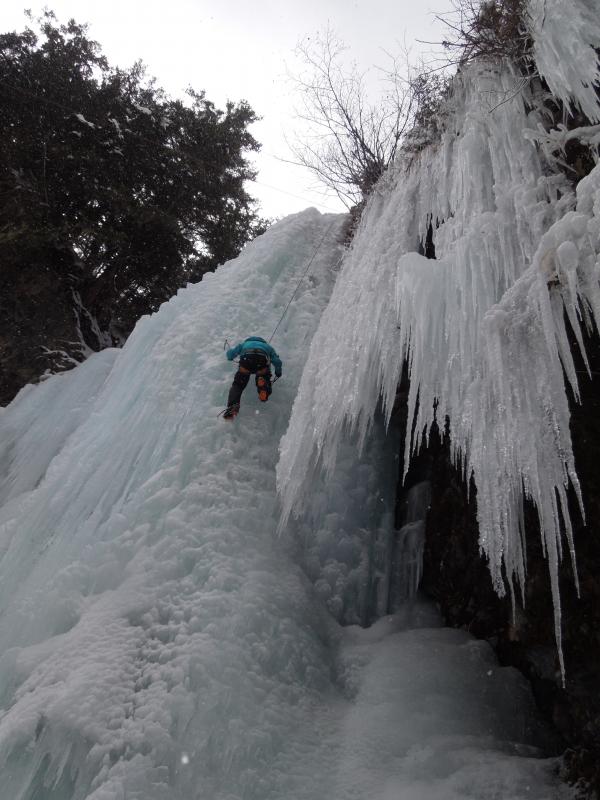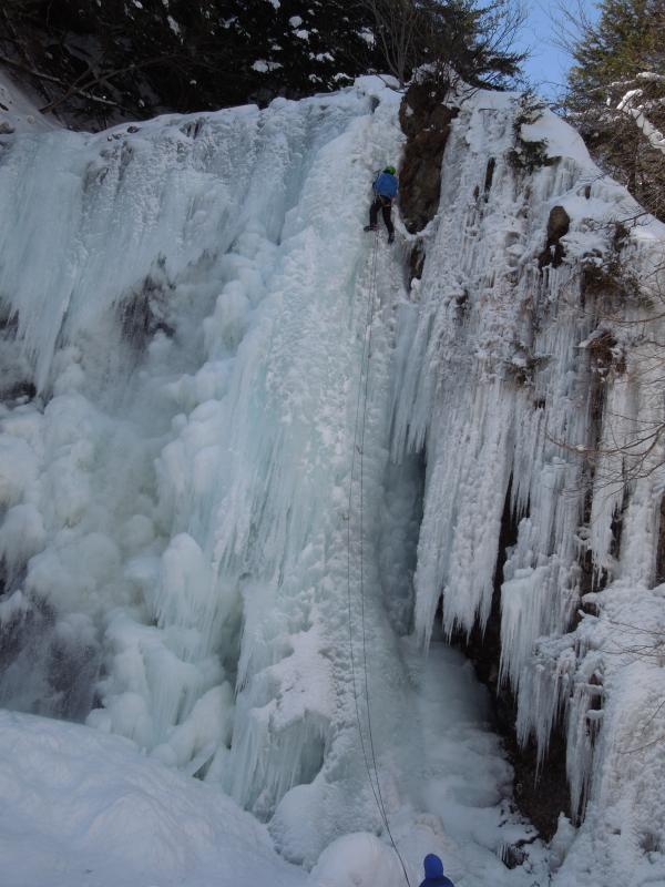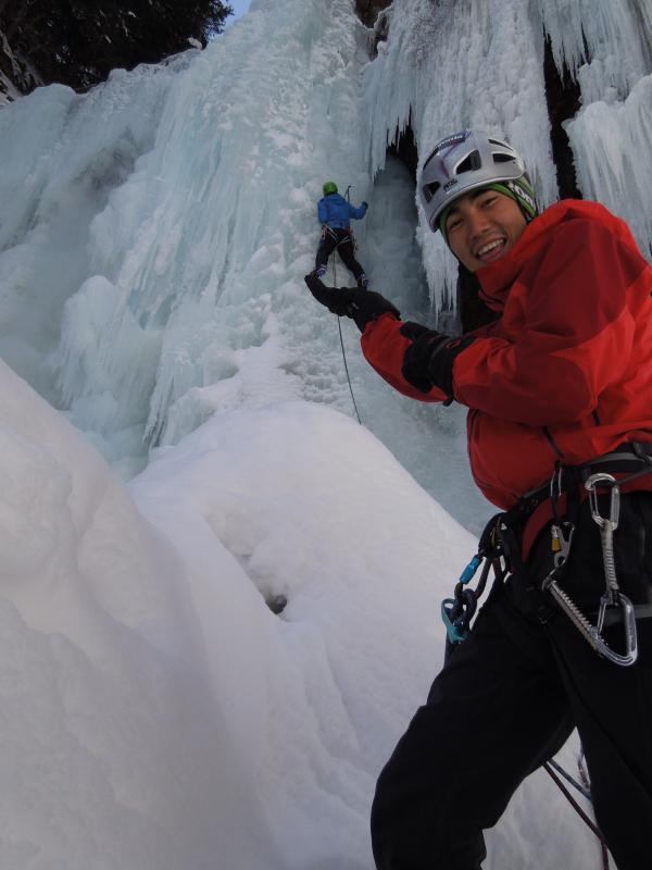 気温は0℃前後、滴をかぶりながらのクライミングでしたが、70°~85°くらいの20mの氷瀑、もう最高です。アイスクライミングはまだ初心者ですが、リードでなんとかトップアウトできたのはとにかく嬉しかったです。違うラインも登れたらもっと良かったのですが、結氷の都合と時間の都合でメンバーが1回づつ登るだけとなってしまったのが残念ではあります。