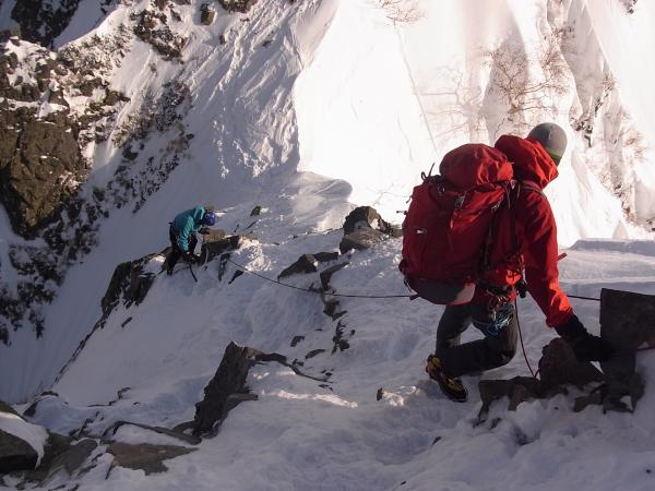 しかし危険な個所は相変わらず危険でした。特に頂上直下の谷(岐阜県側)では、私たちパーティーが着いた時に滑落者が出ており、県警に救助要請をするという一幕もありました。幸いその方はケガで済みましたが、300mほどは落ちていましたので命を落としてもおかしくなかったと思います。