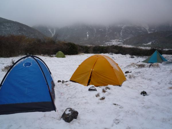 2日目は テントから起きたらまさかの積雪です。