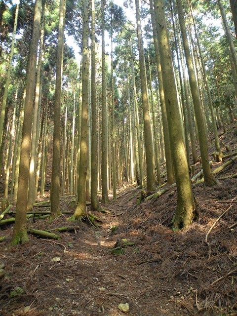 最初、杉林の中の道を登って行きます。間伐されていてあまり暗くない林です。少し道が湿っています。やがて尾根に登り上げて行きます。