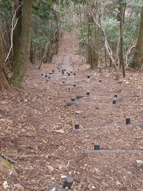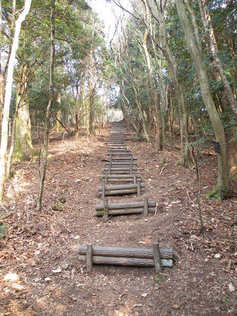 明るい尾根沿いの道は、最初ふかふかの道。階段があります。