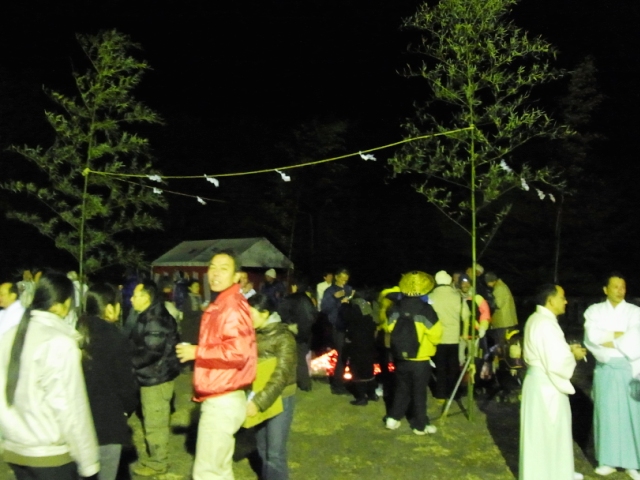 午後2時に古宮址を出発、神官さんは霧島神社の灯を、他の人は薪を担いで登山。