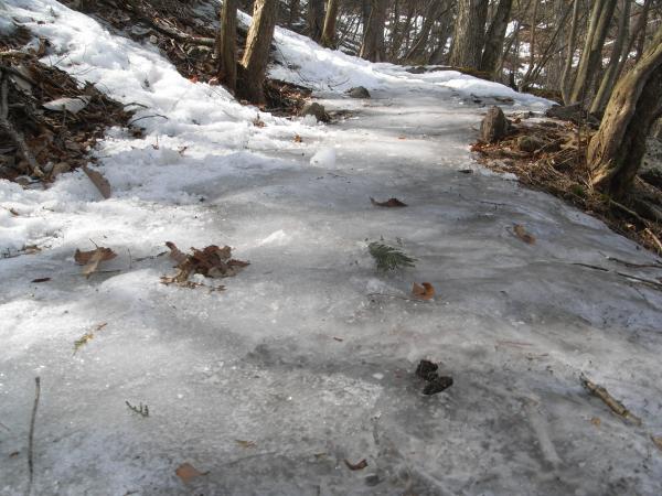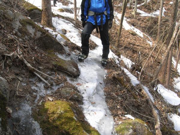 - どちらの山も残雪の山歩きになります。雪の下はガチガチのアイスバーンなので軽アイゼンは必携です。