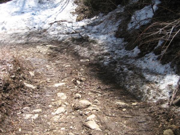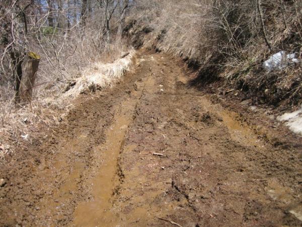 - 所々雪解けの水や山小屋のジープの轍などがあり、ドロドロの田んぼ状態。