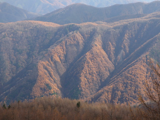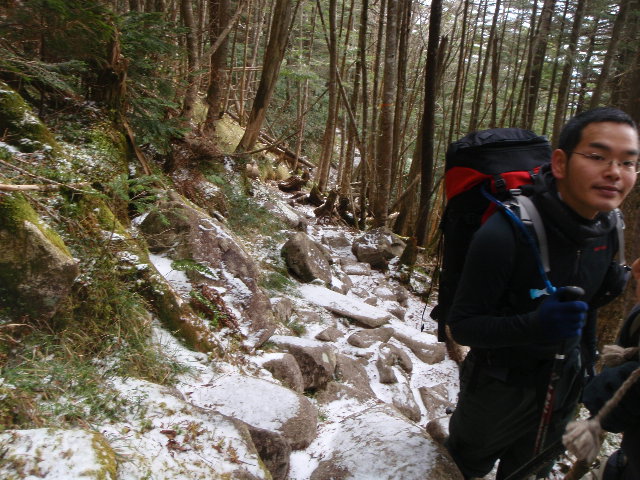 - 標高1900m地点から雪がチラホラ、唐松林の中は落ち葉の上がフカフカで気持ち良い