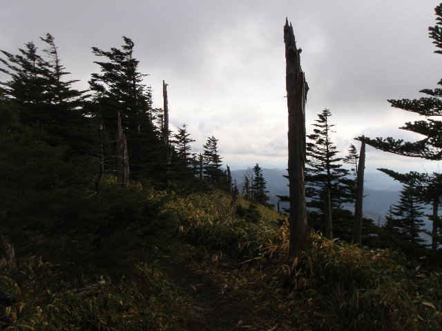 山頂一帯は八ヶ岳を想わせる苔むした物の怪の世界を感じます、山頂は生憎のロケーションで、